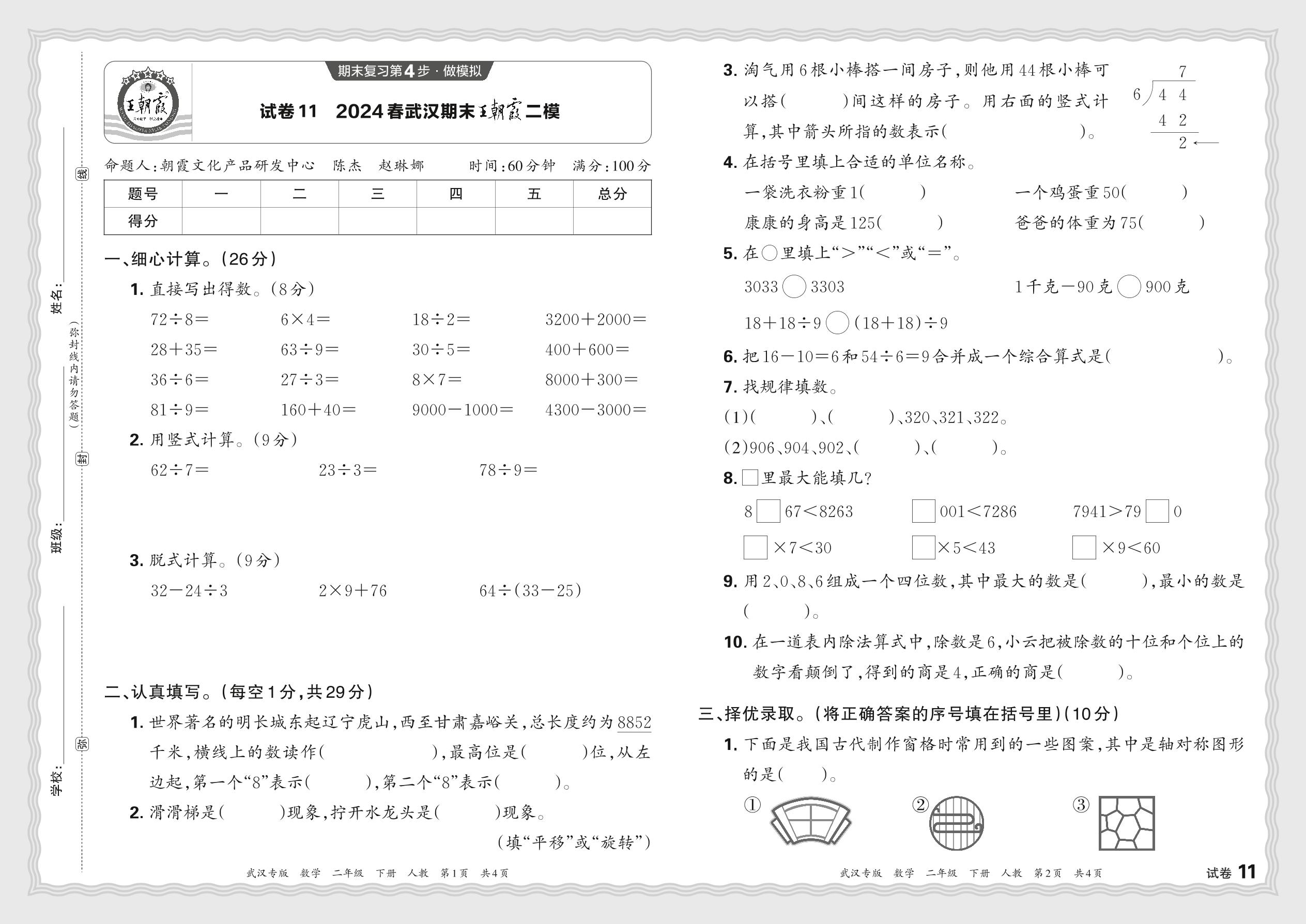 2024春下册二年级数学人教版 湖北武汉期末王朝霞二模
