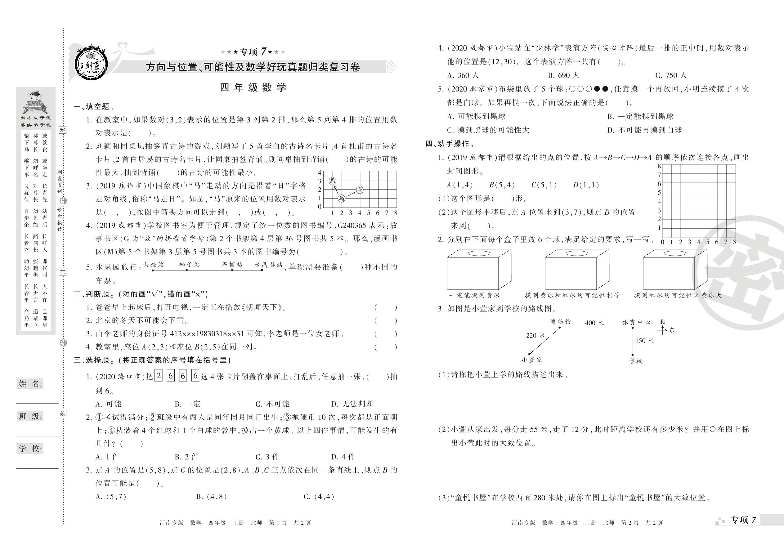 王朝霞期末专项卷——方向与位置、可能性及数学好玩真题归类复习、新颖题速递:生活与数学四年级上册数学(北师版)【0】