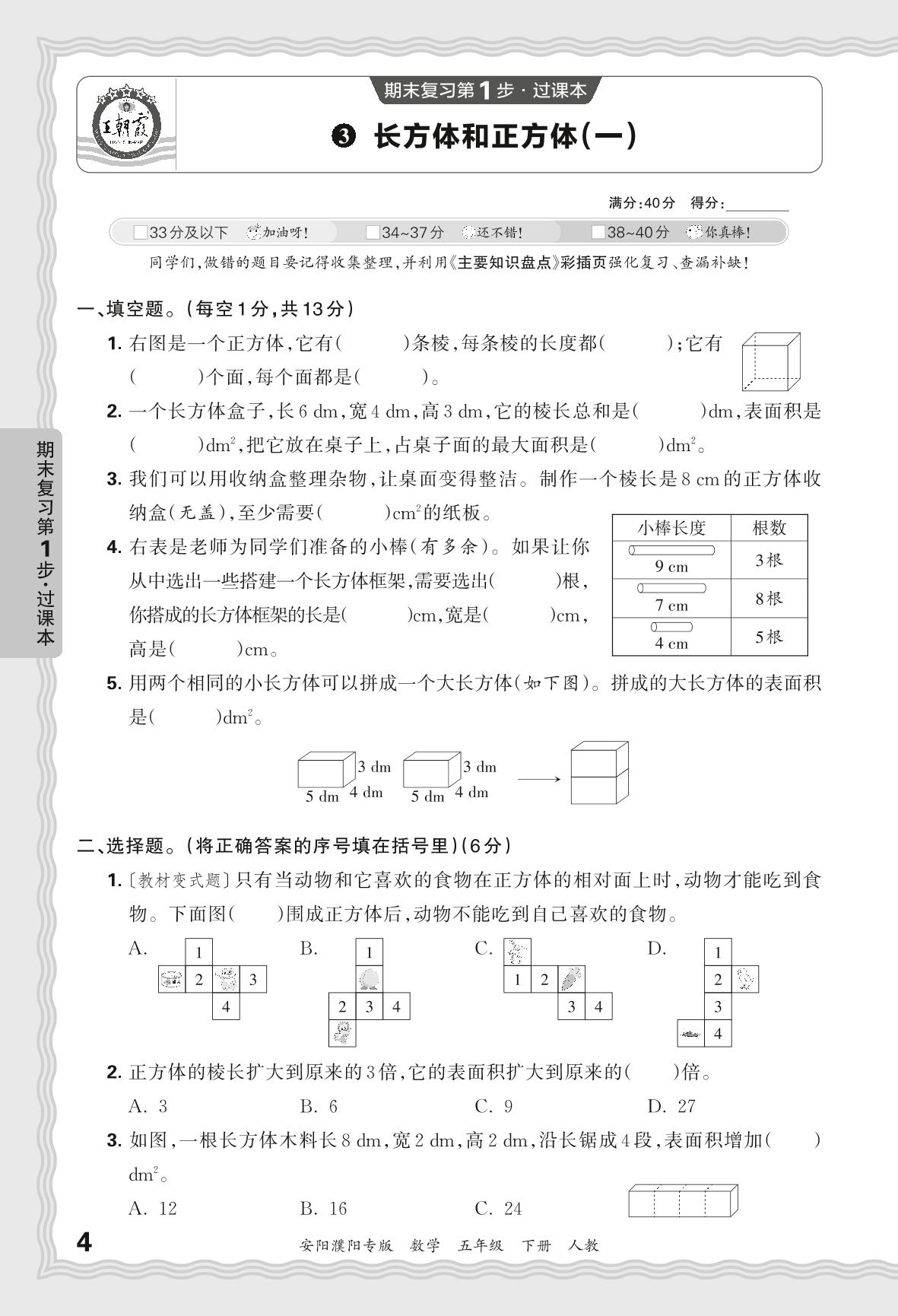 2024春下册五年级数学人教版 期末过课本安阳濮阳版·长方体和正方体(一)【3】
