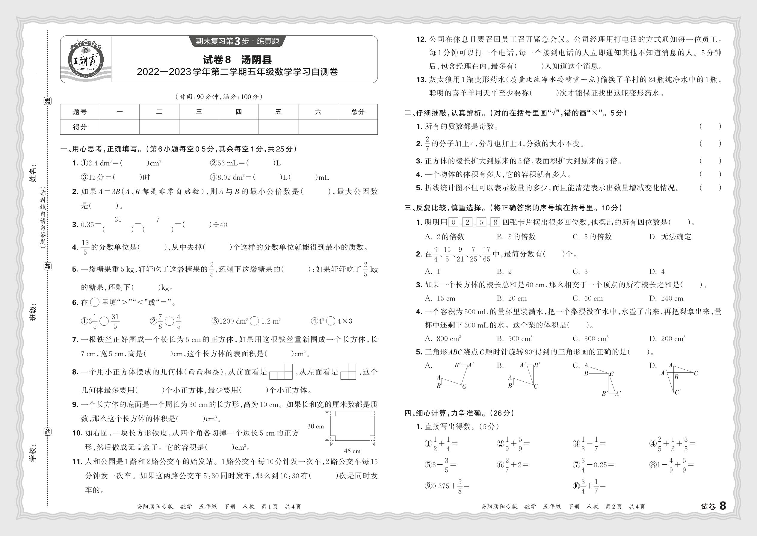 河南省安阳市汤阴县2022-2023学年第二学期五年级数学学习自测卷(人教版)【8】