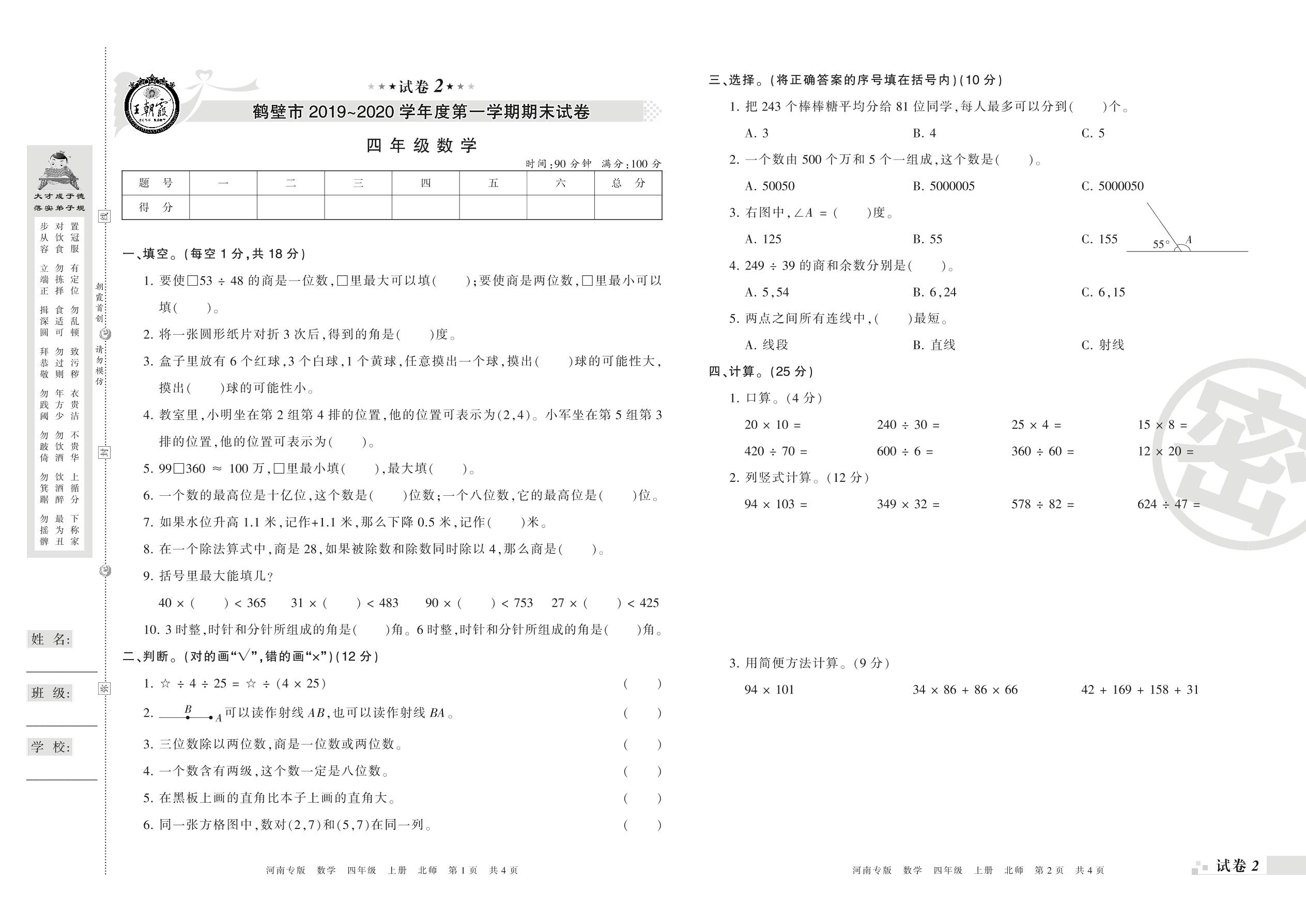 2019-2020学年第一学期鹤壁市四年级数学试卷(北师版)【2】