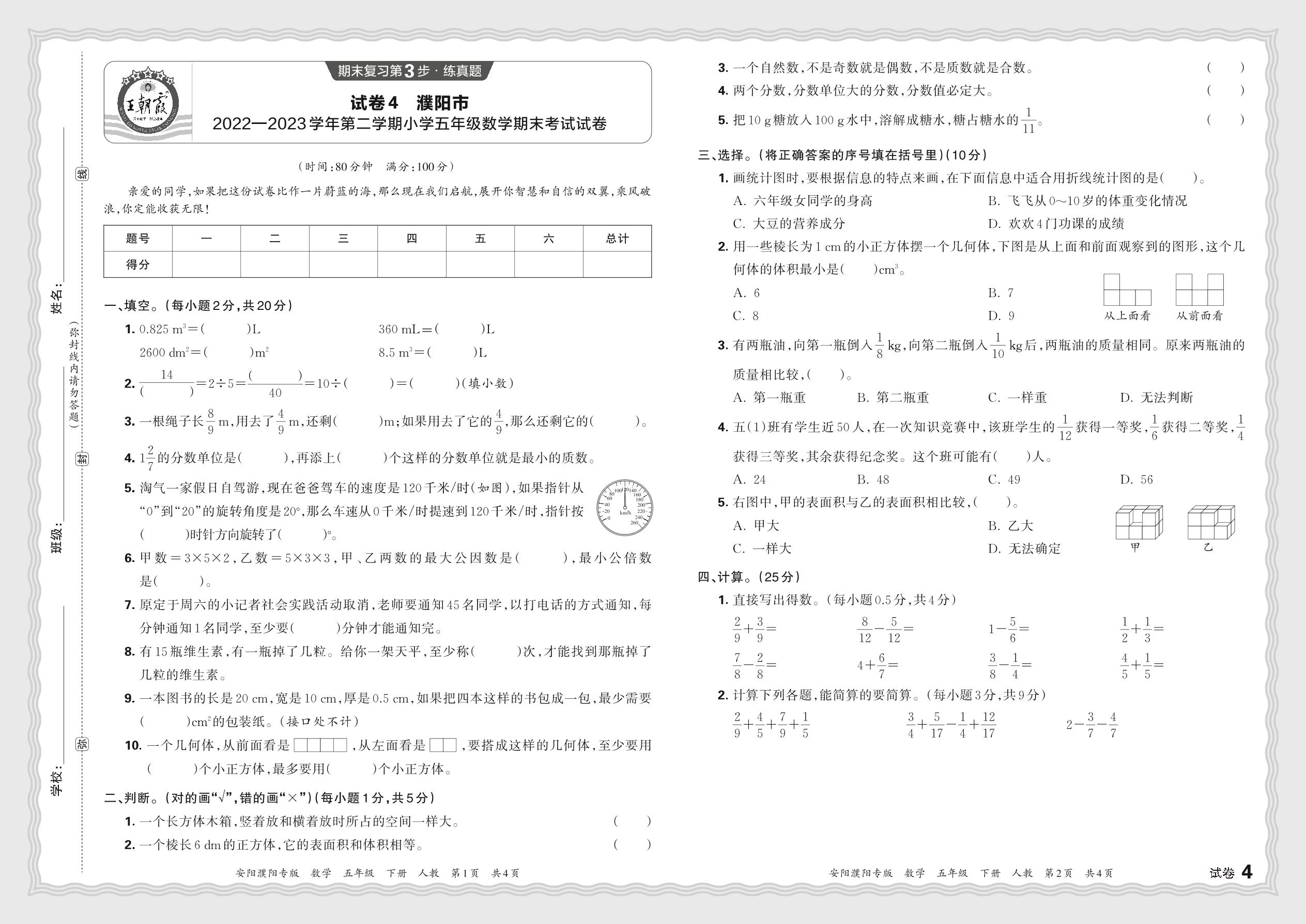河南省濮阳市2022-2023学年第二学期小学五年级数学期末考试试卷(人教版)【4】