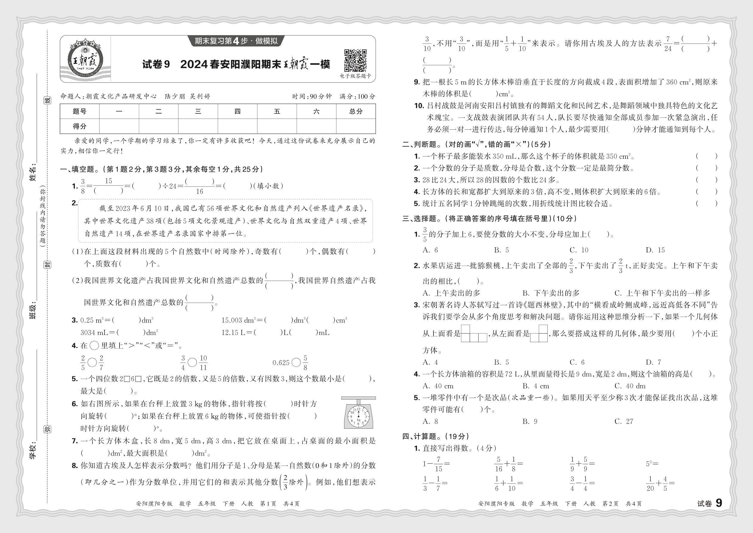 2024春下册五年级数学人教版 河南安阳濮阳期末王朝霞一模【9】