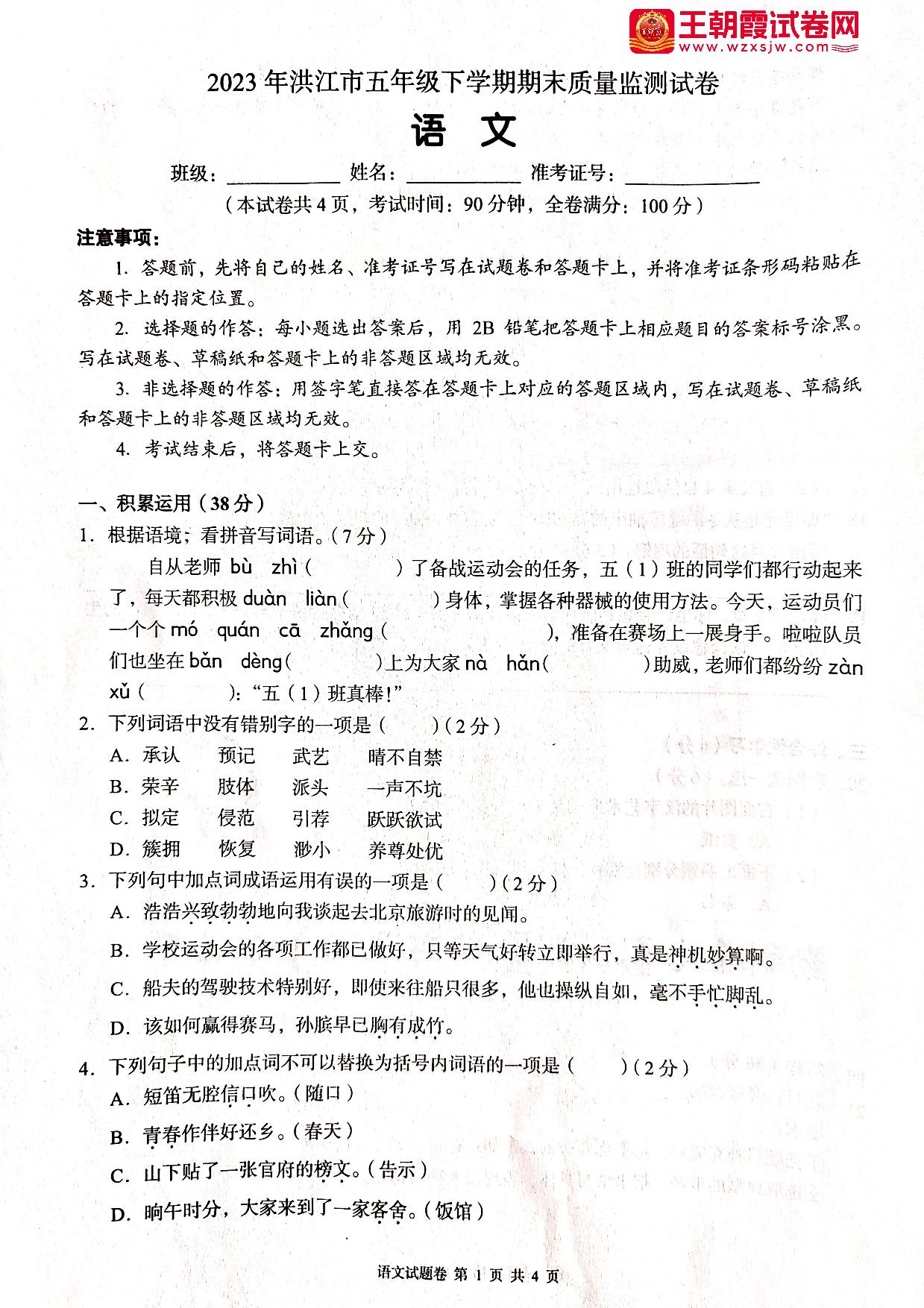 湖南省怀化市洪江市2022-2023学年下学期期末质量监测试卷五年级语文(人教版)