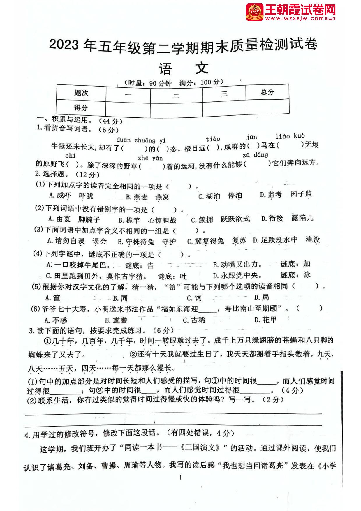 五年级语文人教版下册期末卷