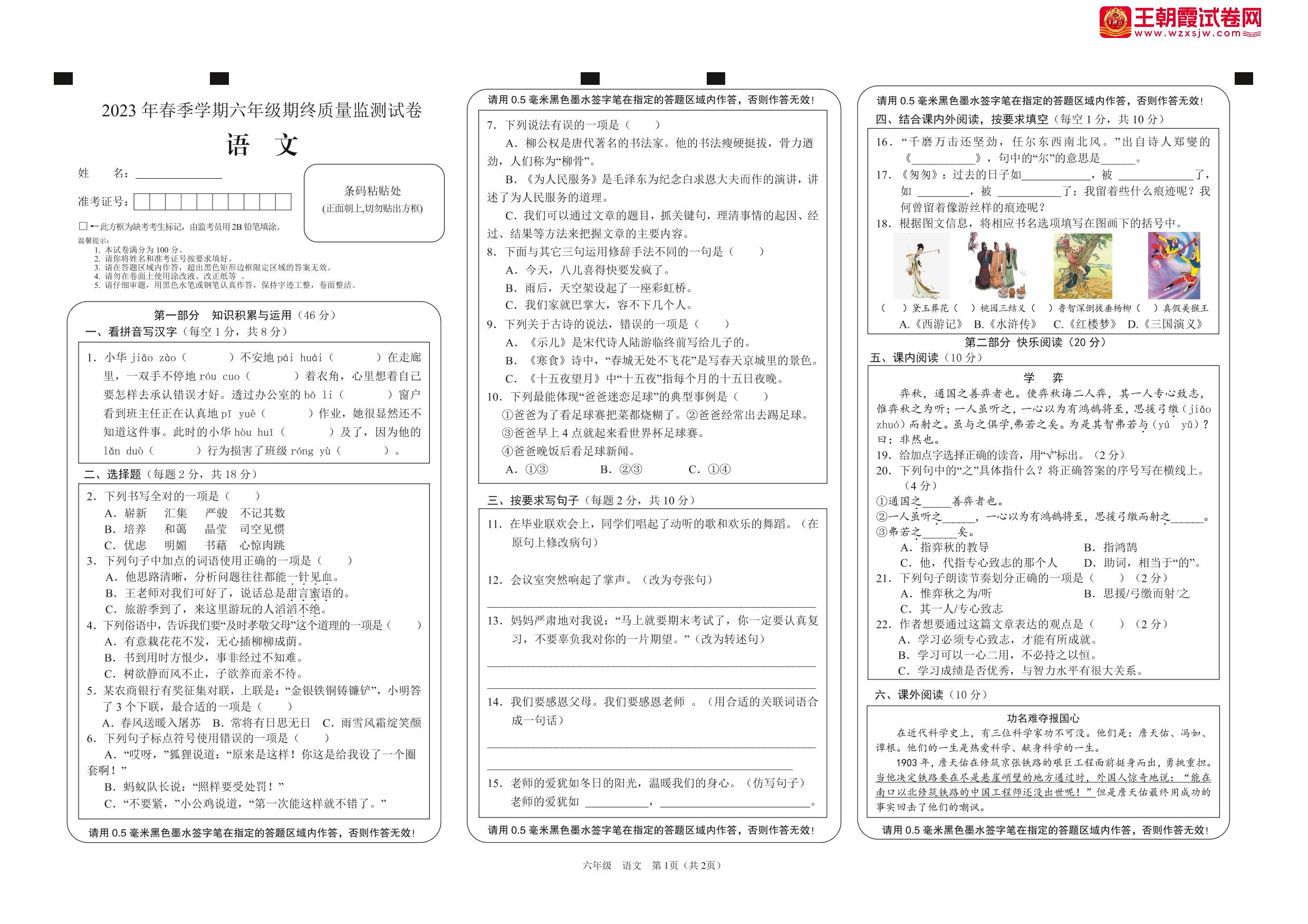 六年级语文人教版下册期末卷