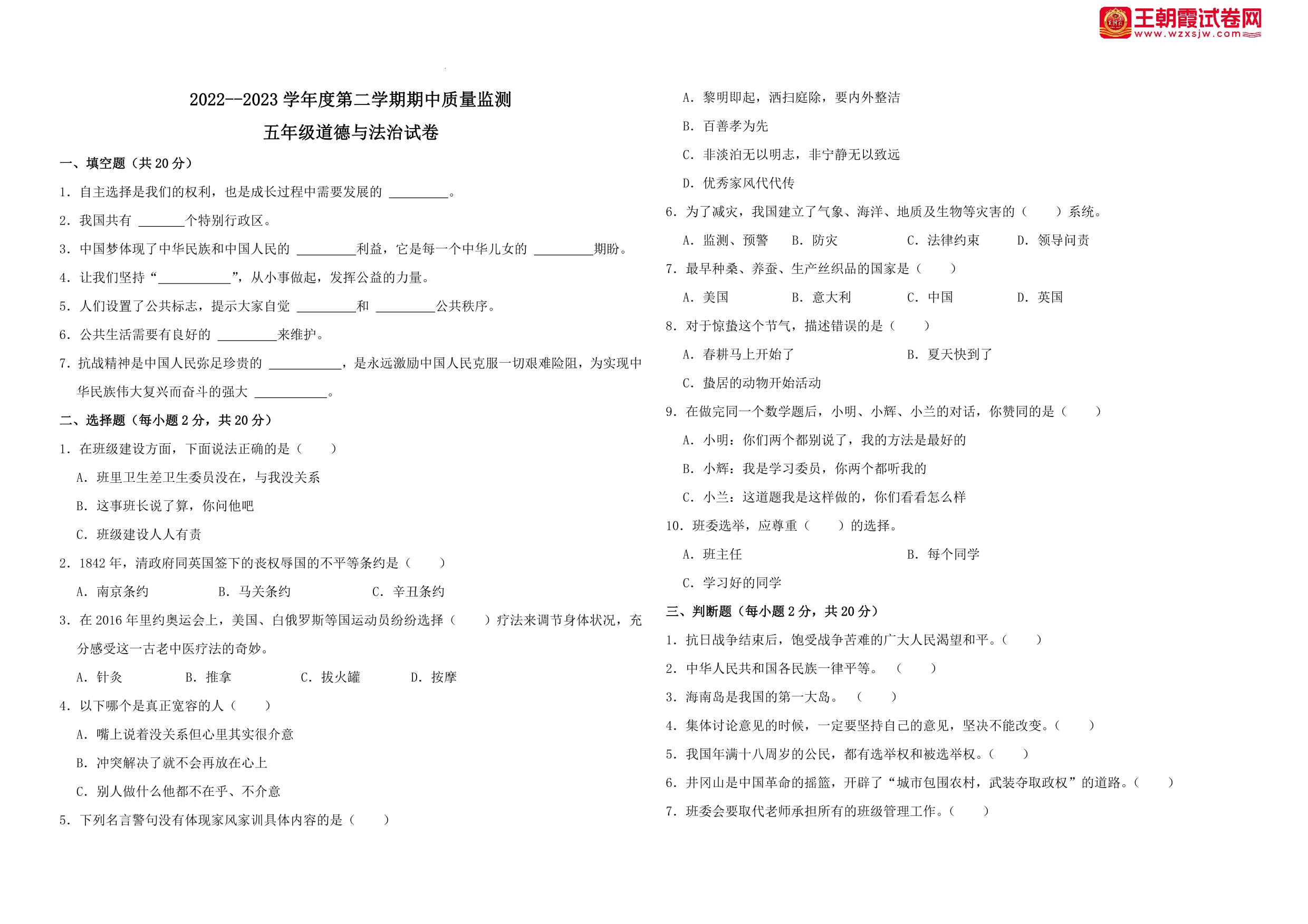 辽宁省鞍山市海城市2022-2023学年度第二学期期中质量监测五年级道德与法治(人教版)