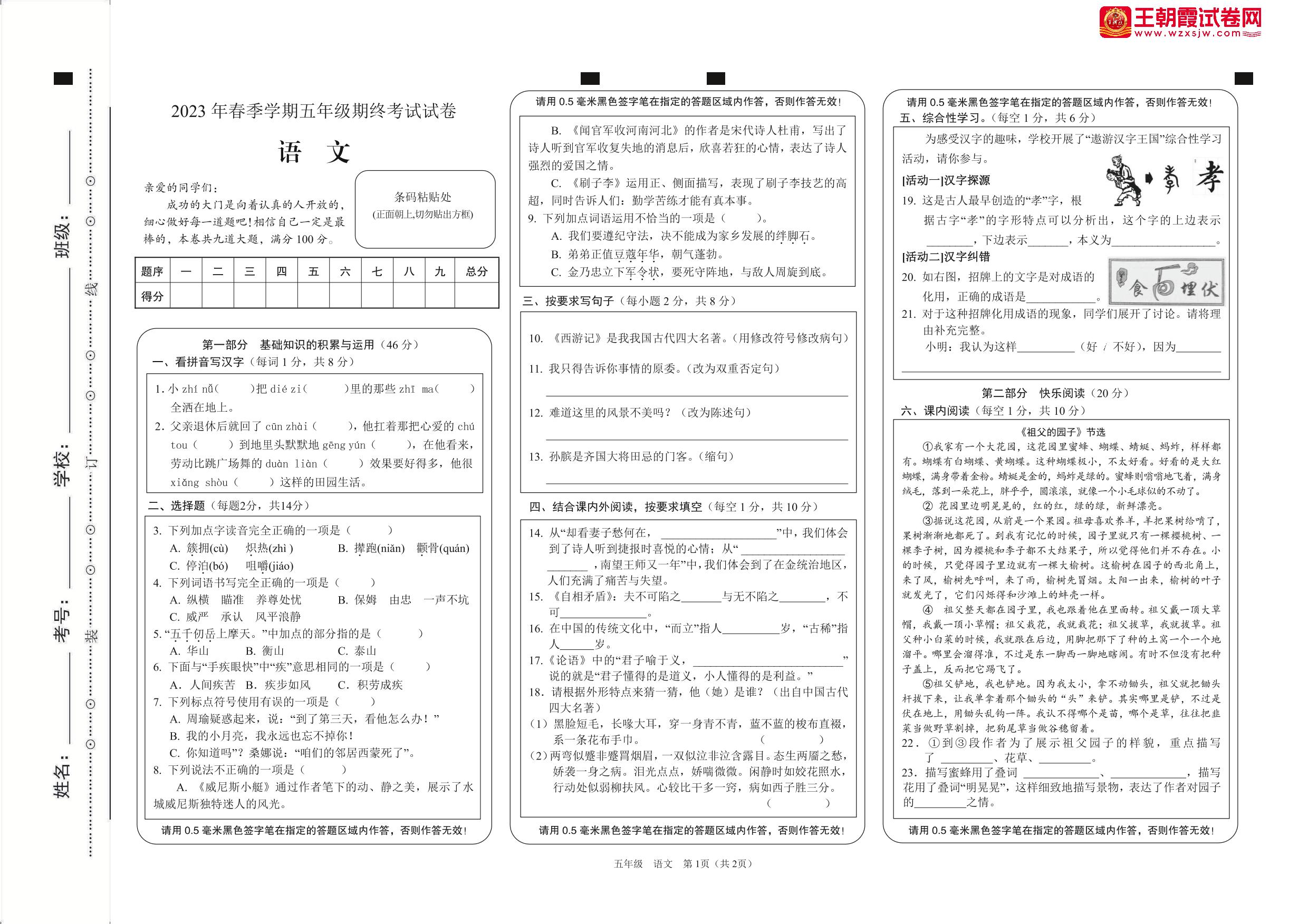五年级语文人教版下册期末卷
