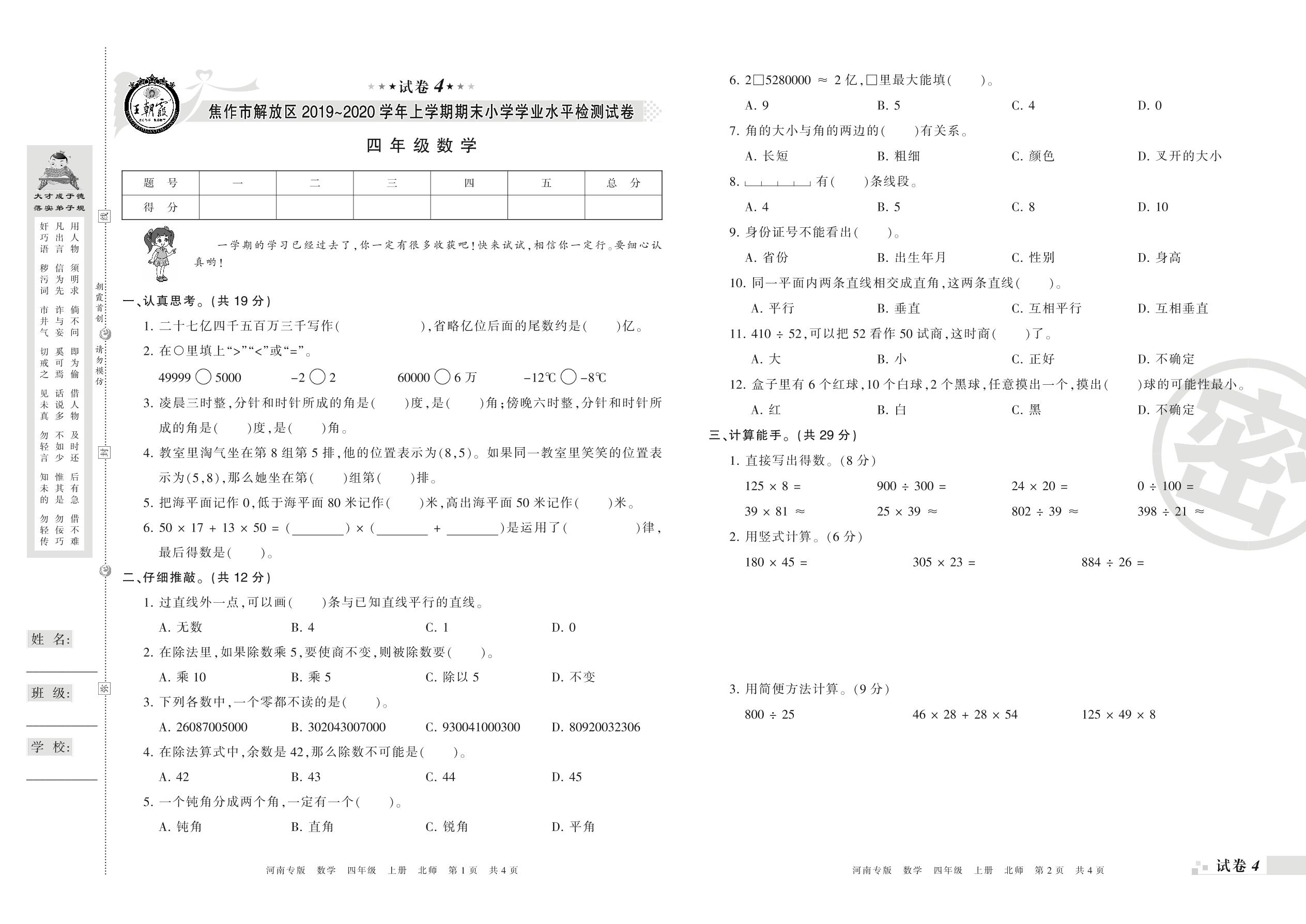 2019-2020学年第一学期焦作市解放区四年级数学试卷(北师版)【4】