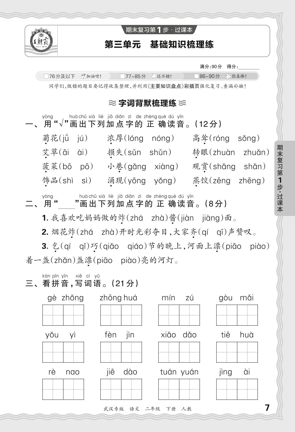 2024春下册二年级语文人教版 期末过课本武汉版·第三单元基础知识梳理练