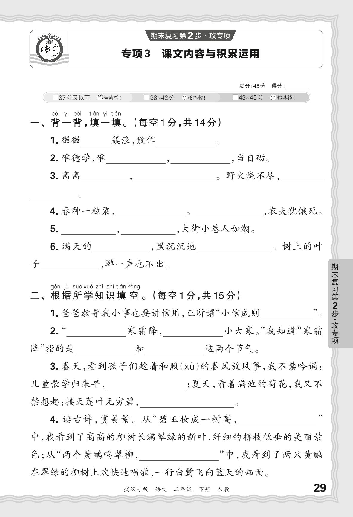 2024春下册二年级语文人教版 期末专项卷武汉版·课文内容与积累运用
