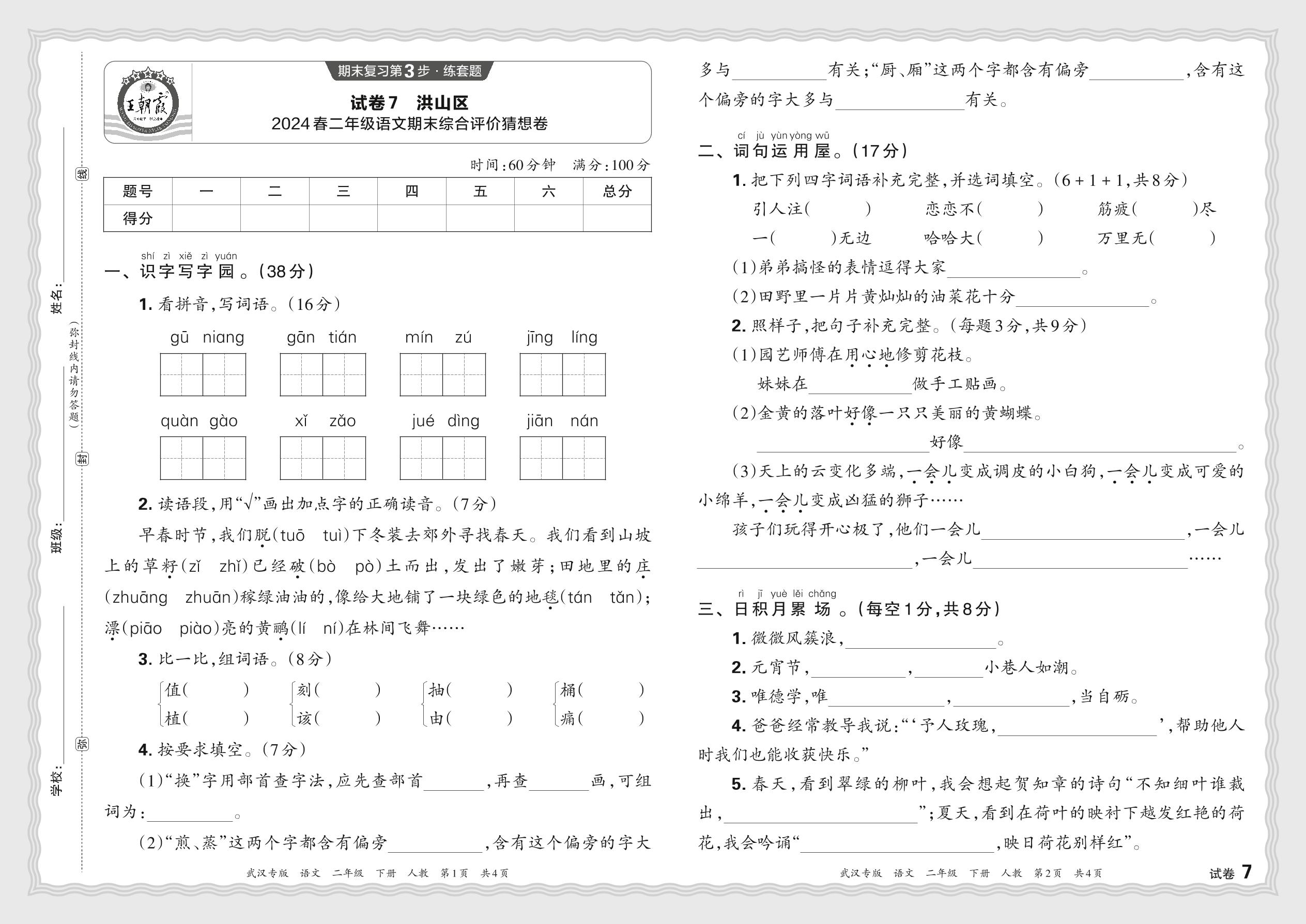 湖北省武汉市洪山区2024春二年级语文期末综合评价猜想卷(人教版)