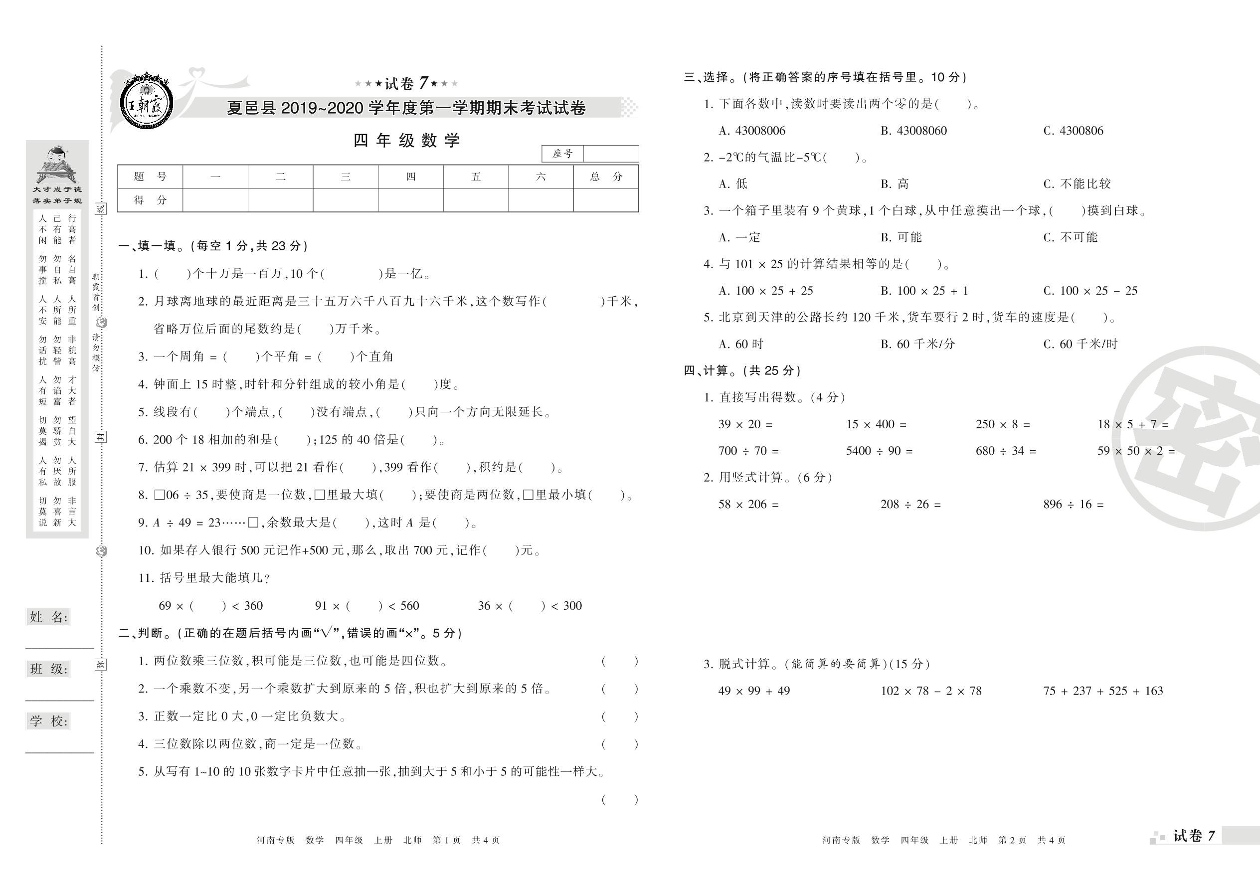 2019-2020学年第一学期商丘市夏邑县四年级数学试卷(北师版)【7】