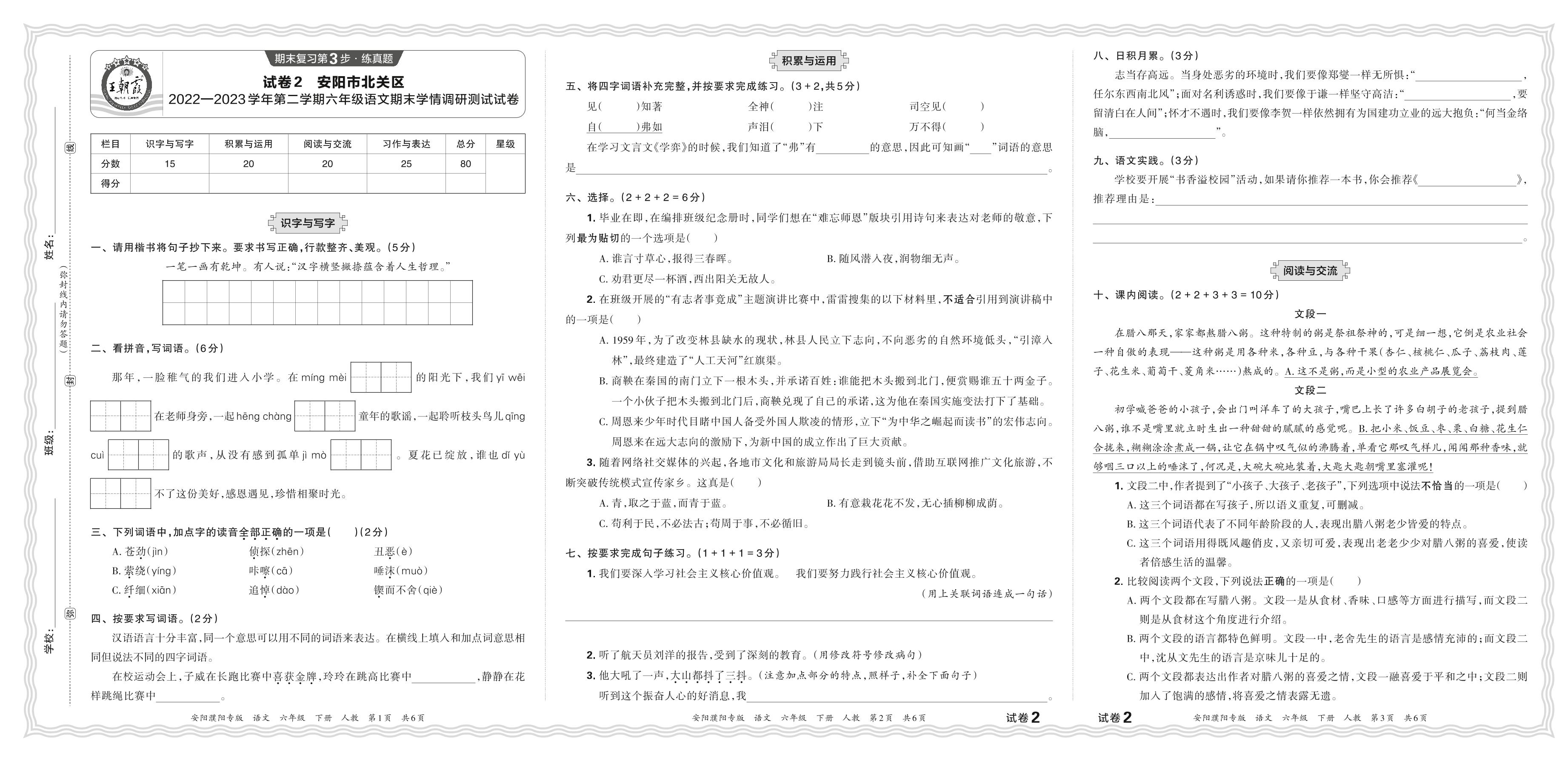 河南省安阳市北关区2022-2023学年第二学期六年级语文期末学情调研测试试卷(人教版)【2】