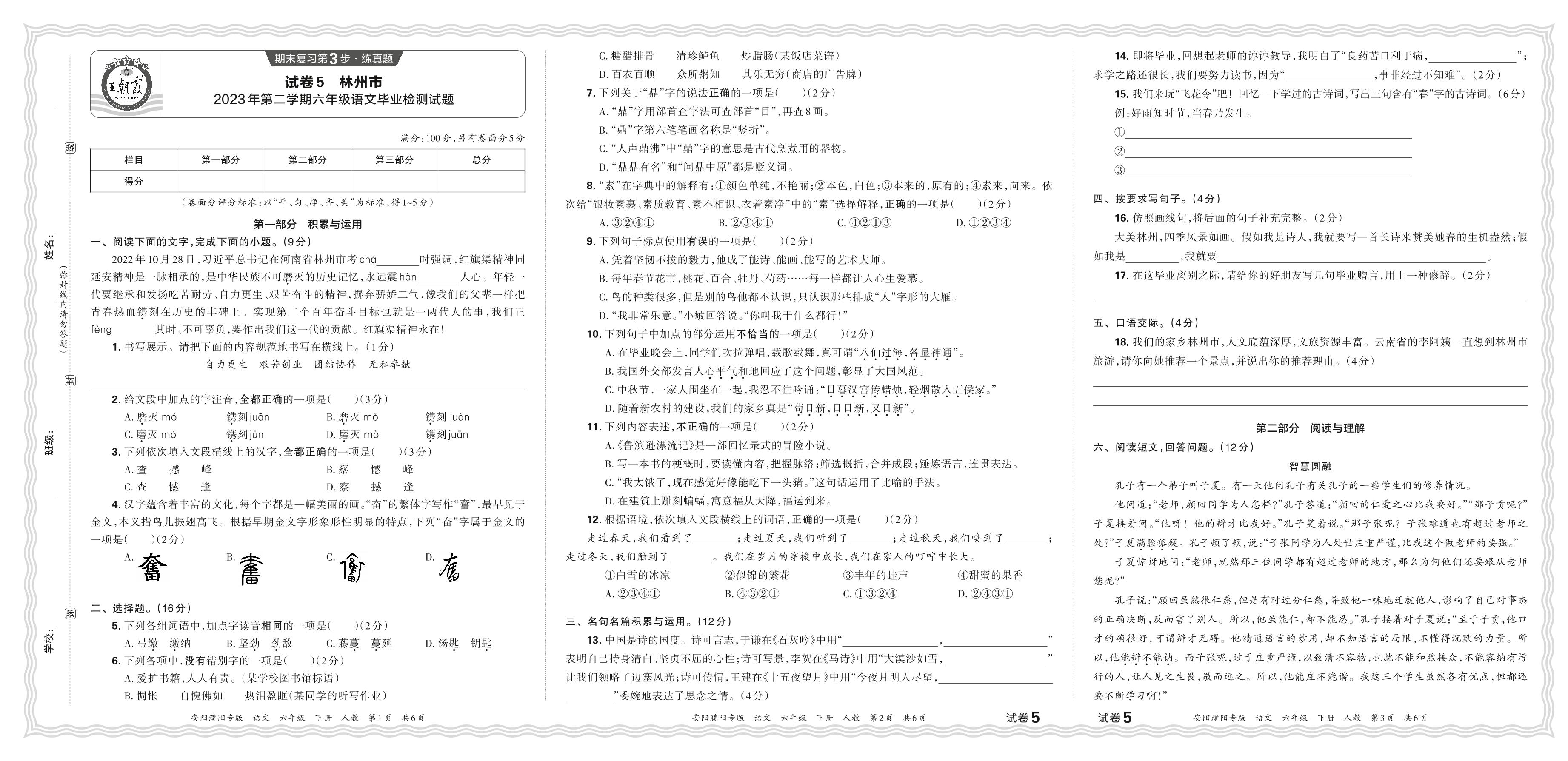河南省安阳市林州市2023年第二学期六年级语文毕业检测试题(人教版)【5】