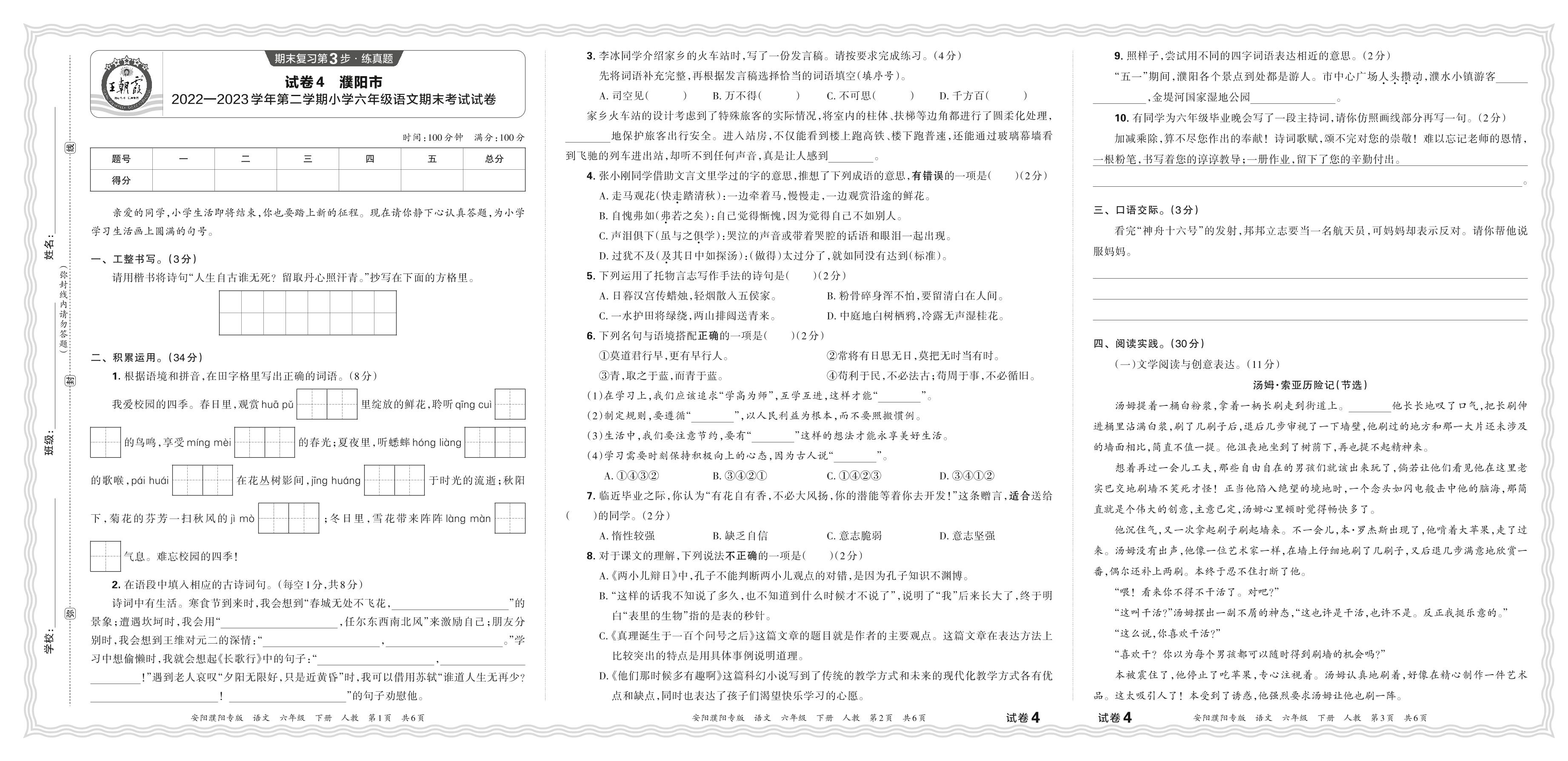 河南省濮阳市2022-2023学年第二学期小学六年级语文期末考试试卷(人教版)【4】
