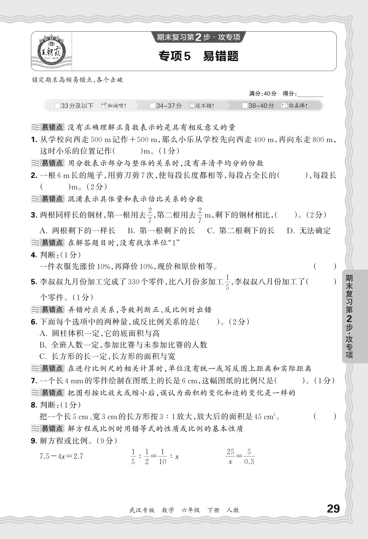2024春下册六年级数学人教版 期末专项卷武汉版·易错题【5】