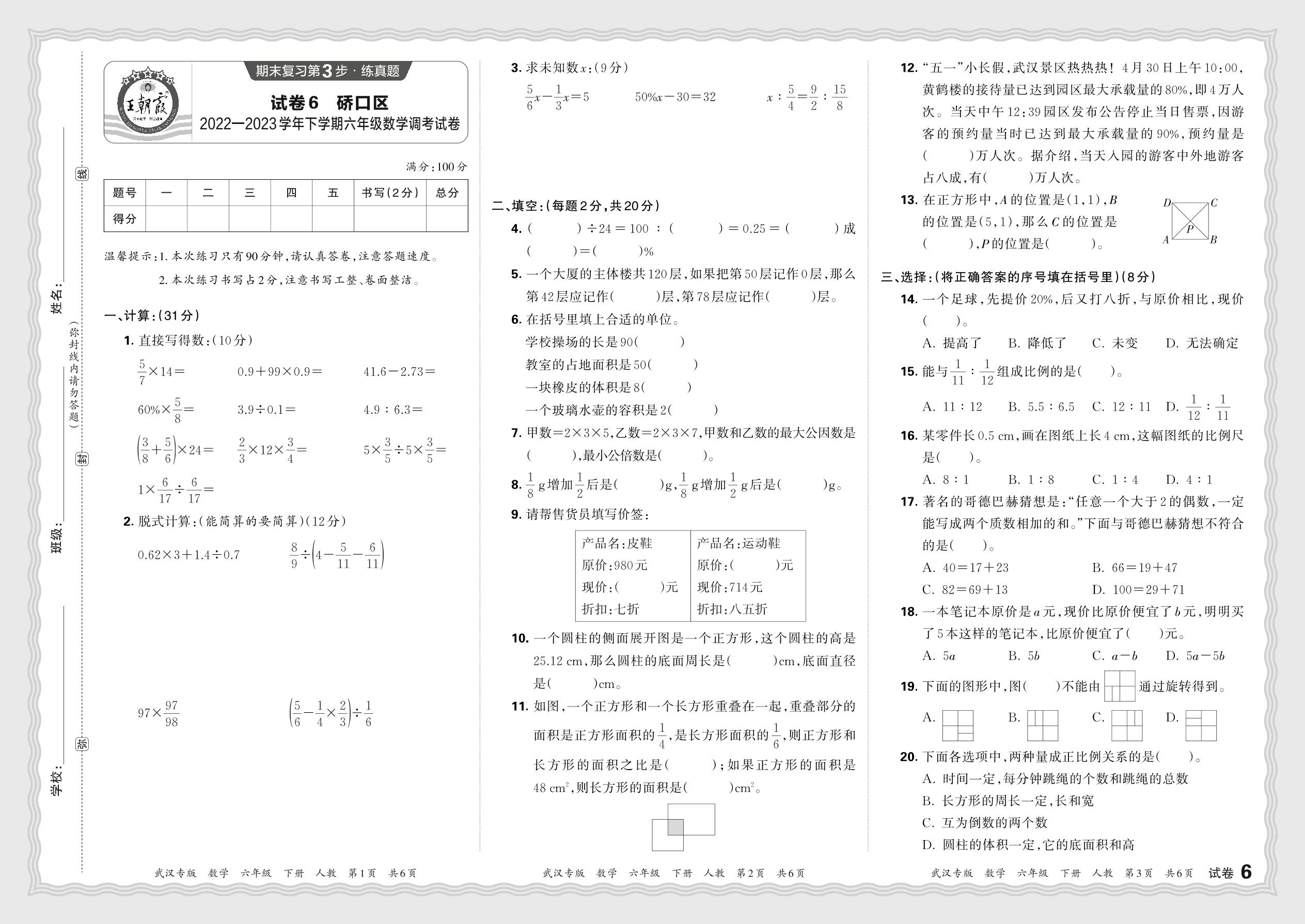 湖北省武汉市硚口区2022—2023学年下学期六年级数学调考试卷(人教版)【6】