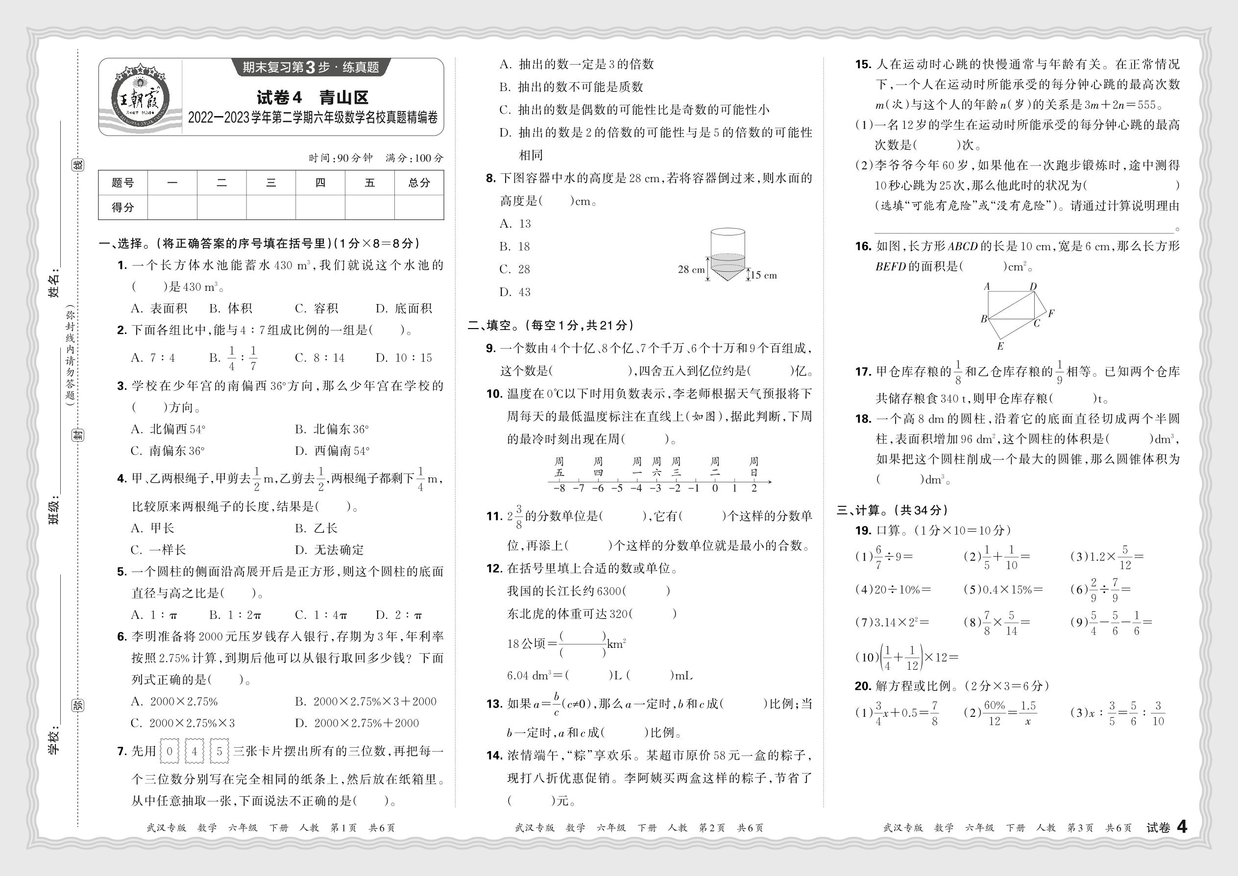 湖北省武汉市青山区2022—2023学年第二学期六年级数学名校真题精编卷(人教版)【4】