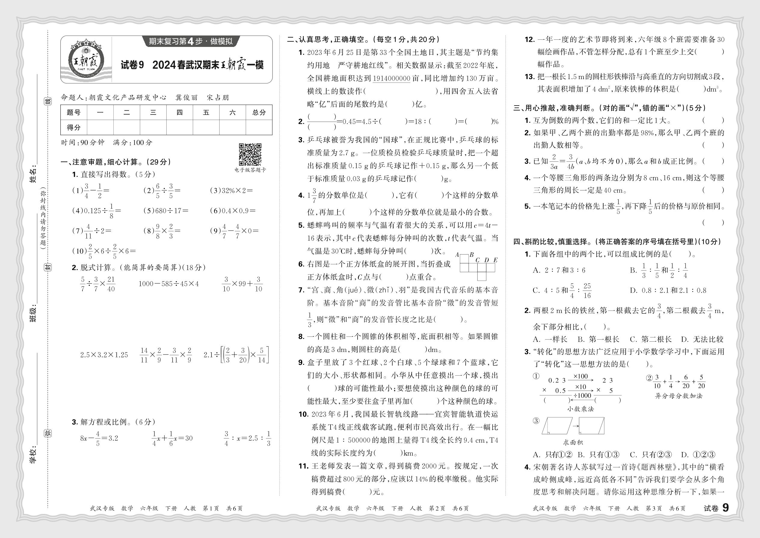 2024春下册六年级数学人教版 湖北武汉期末王朝霞一模