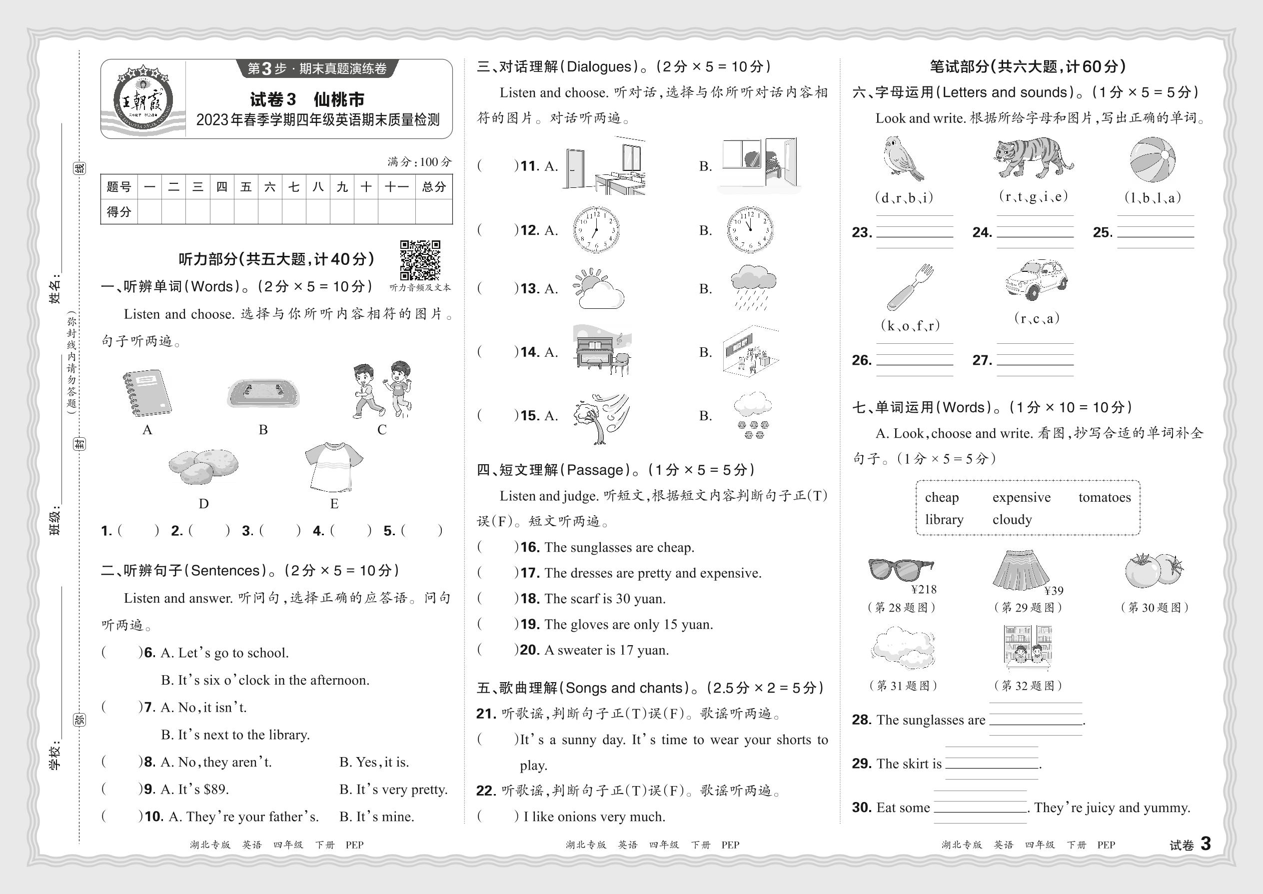 湖北省仙桃市2023年春季学期四年级英语期末质量检测(人教PEP版)【3】