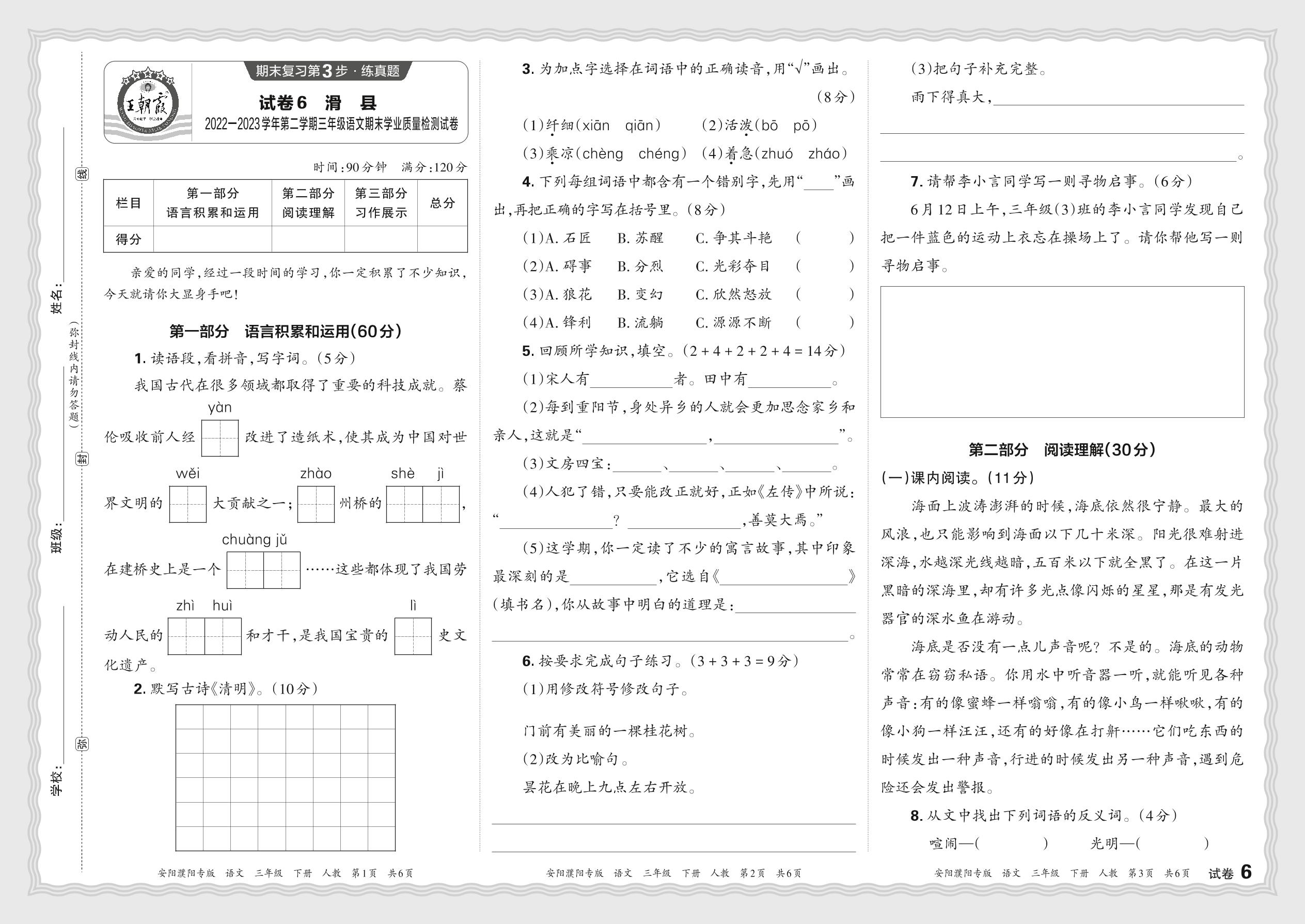 河南省安阳市滑县2022-2023学年第二学期三年级语文期末学业质量检测试卷(人教版)【6】