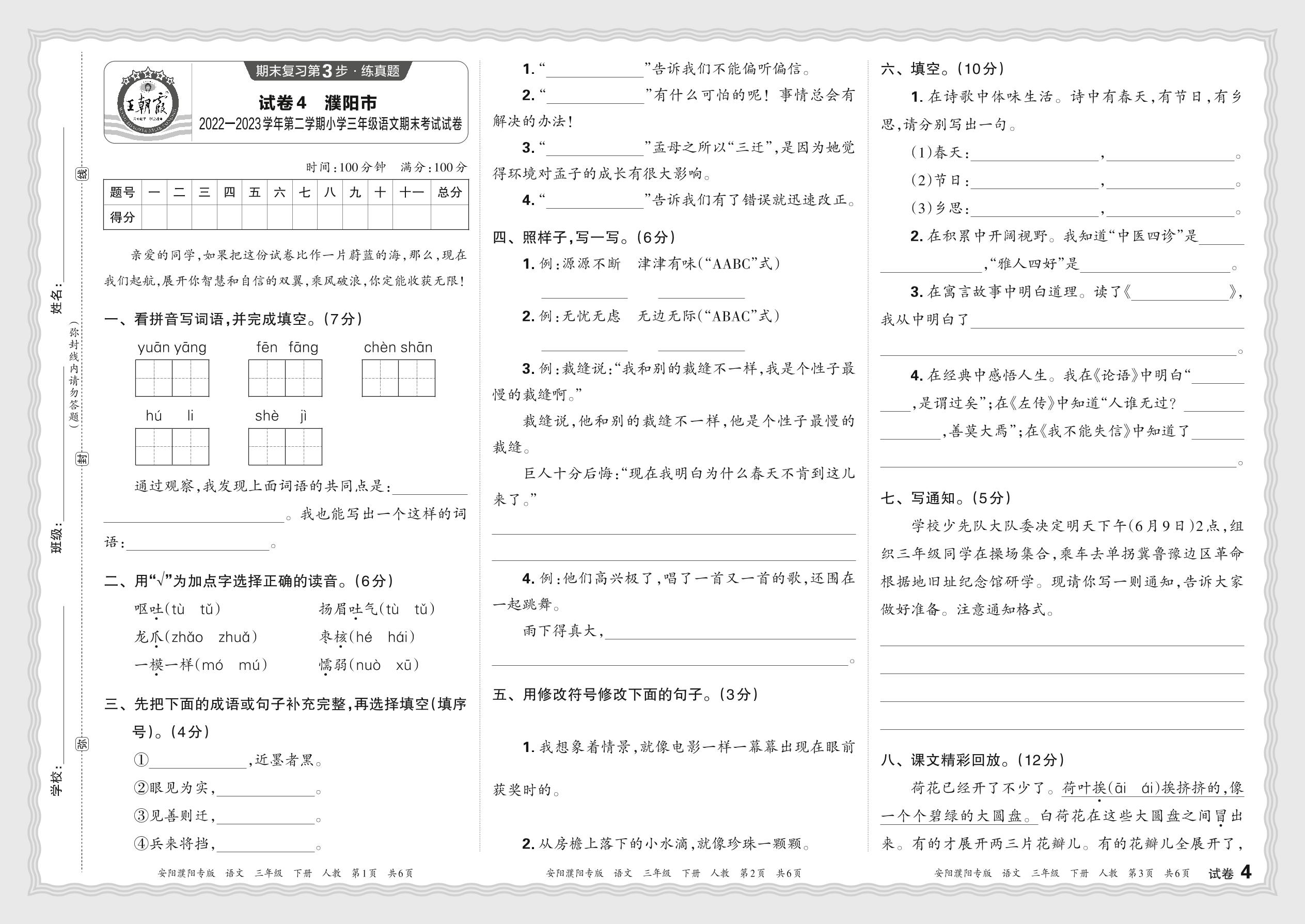 河南省濮阳市2022-2023学年第二学期小学三年级语文期末考试试卷(人教版)【4】