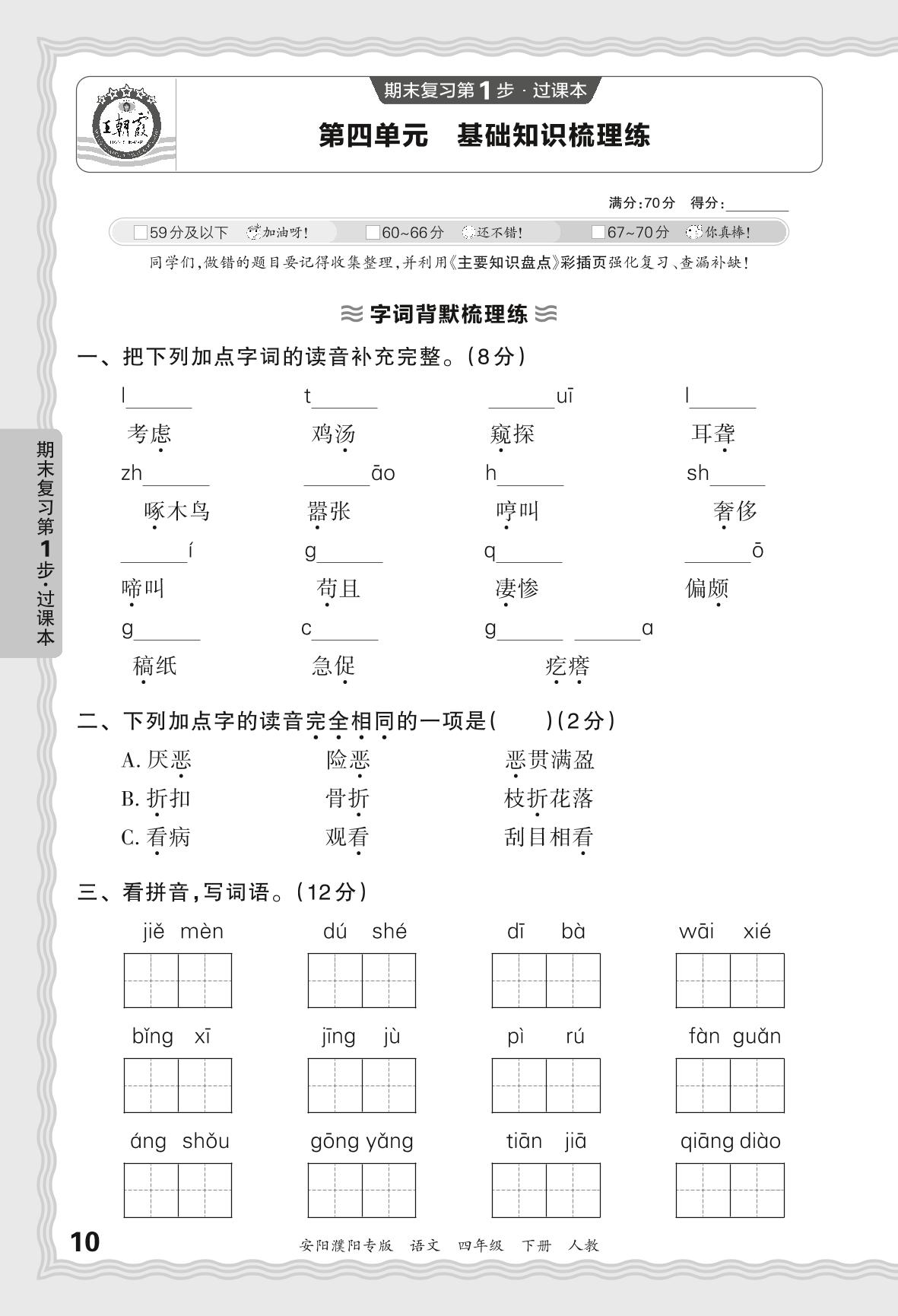 2024春下册四年级语文人教版 期末过课本安阳濮阳版·第四单元 基础知识梳理练