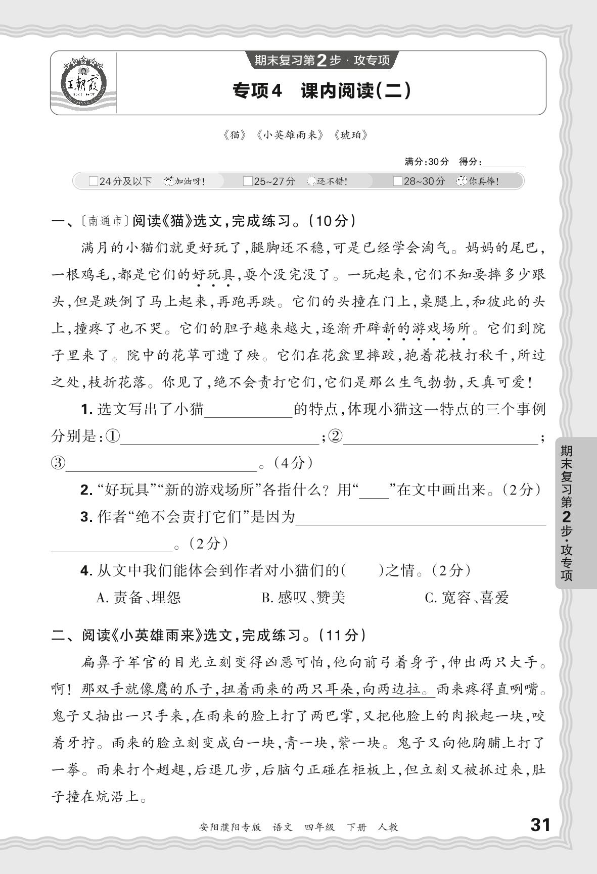 2024春下册四年级语文人教版 期末专项卷安阳濮阳版·课内阅读(二)【4】