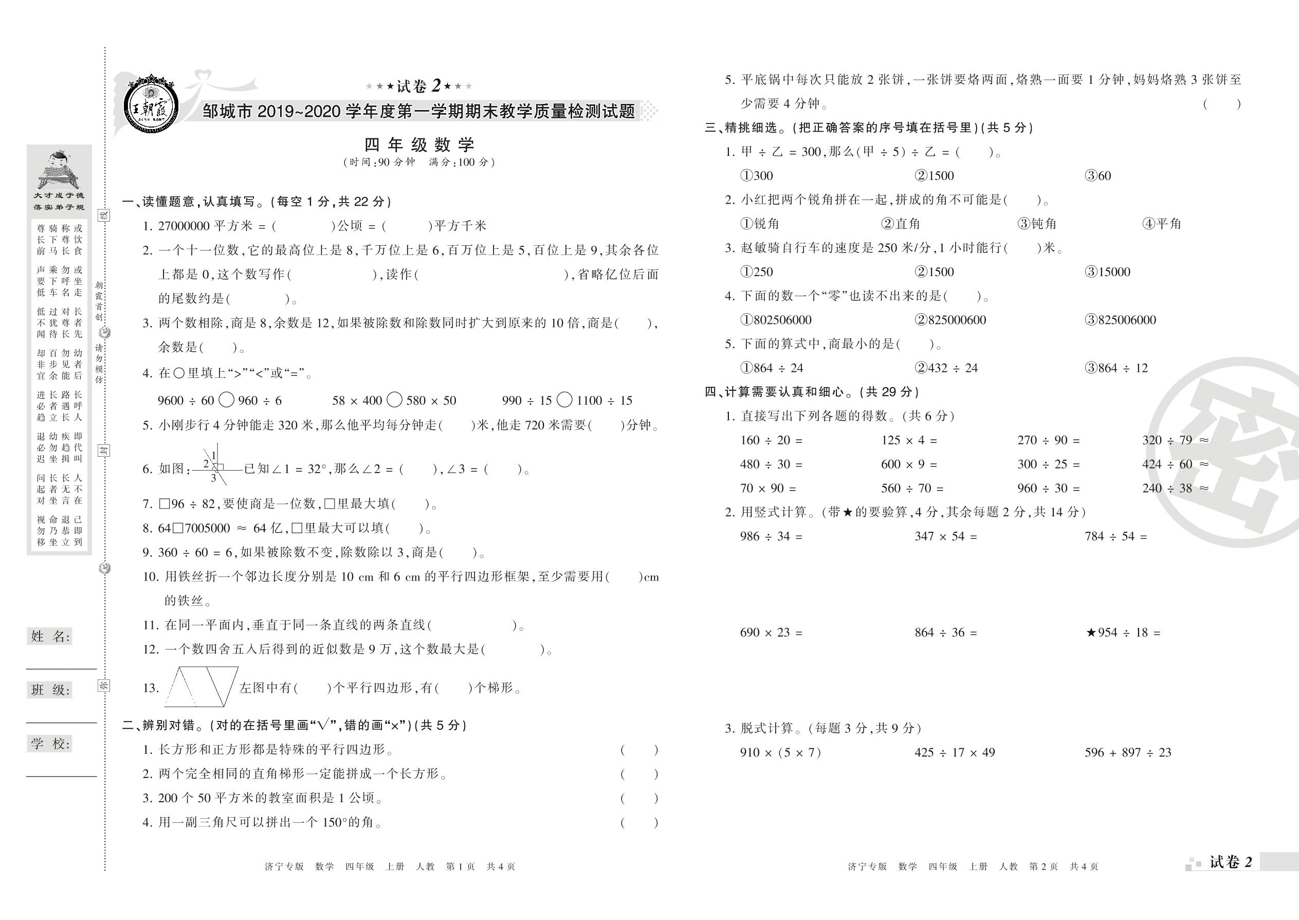 2019-2020学年第一学期邹城市四年级数学试卷(人教版)【2】