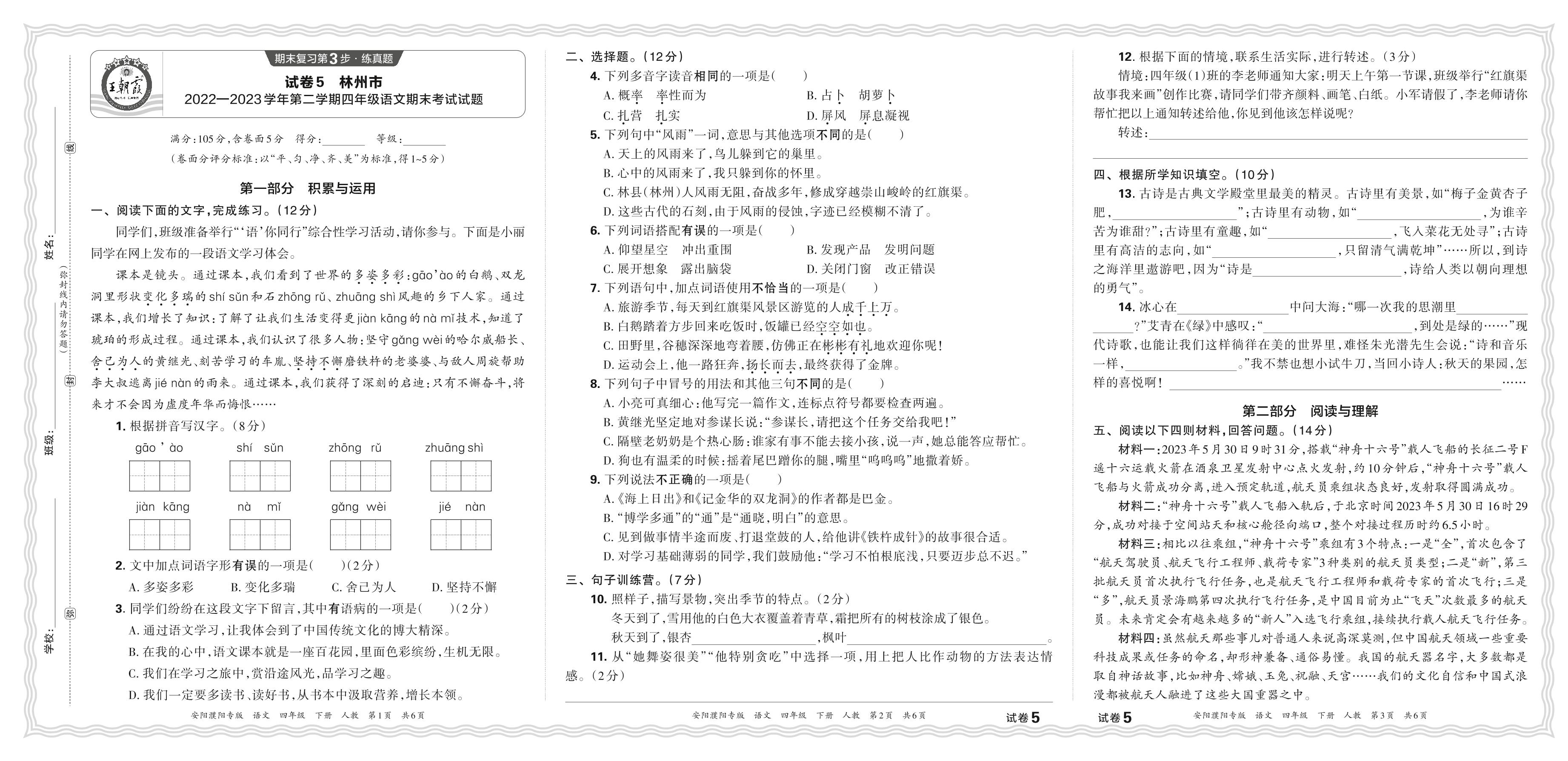 河南省安阳市林州市2022-2023学年第二学期四年级语文期末考试试题(人教版)【5】