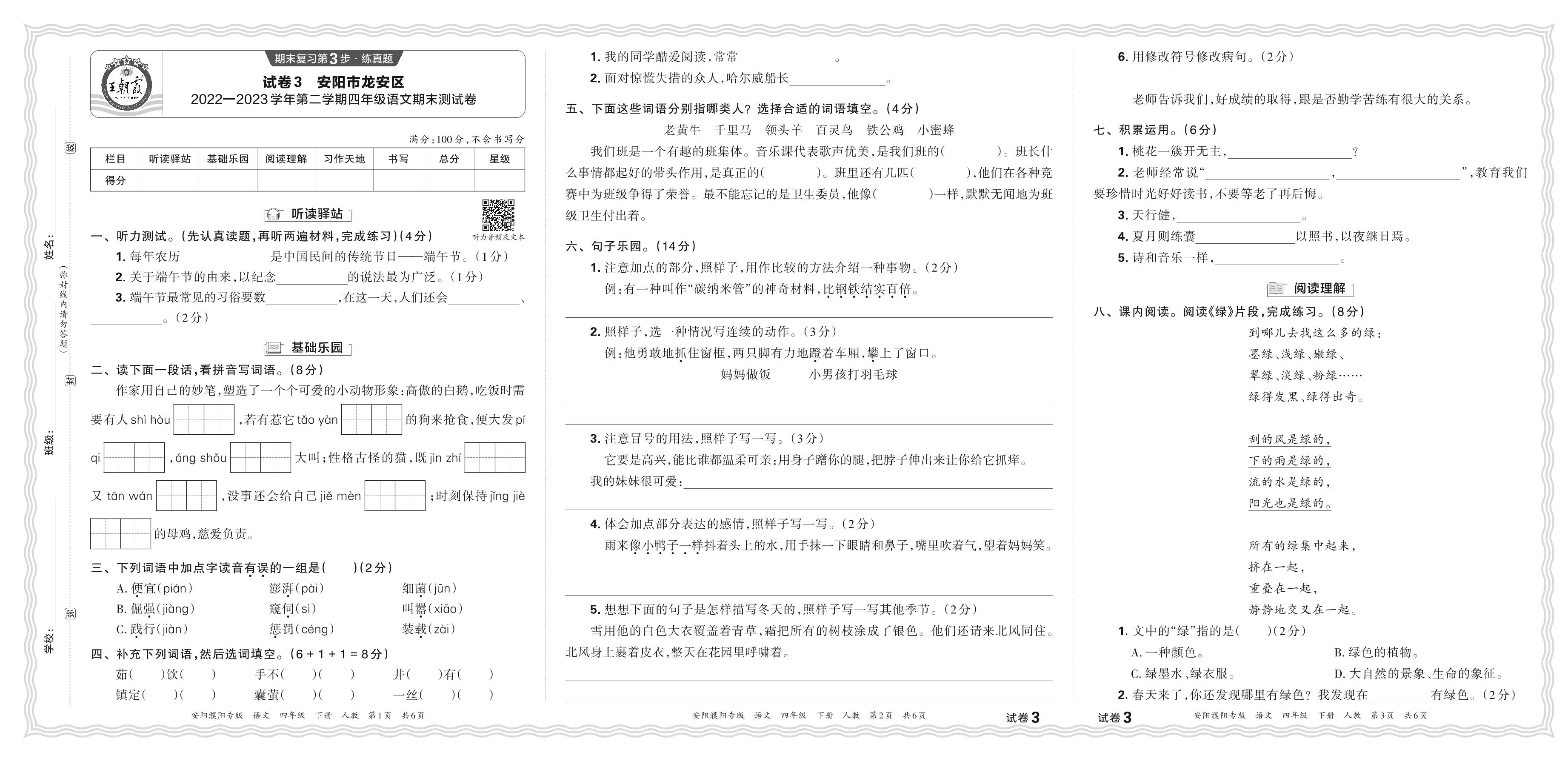 河南省安阳市龙安区2022-2023学年第二学期四年级语文期末测试卷(人教版)【3】