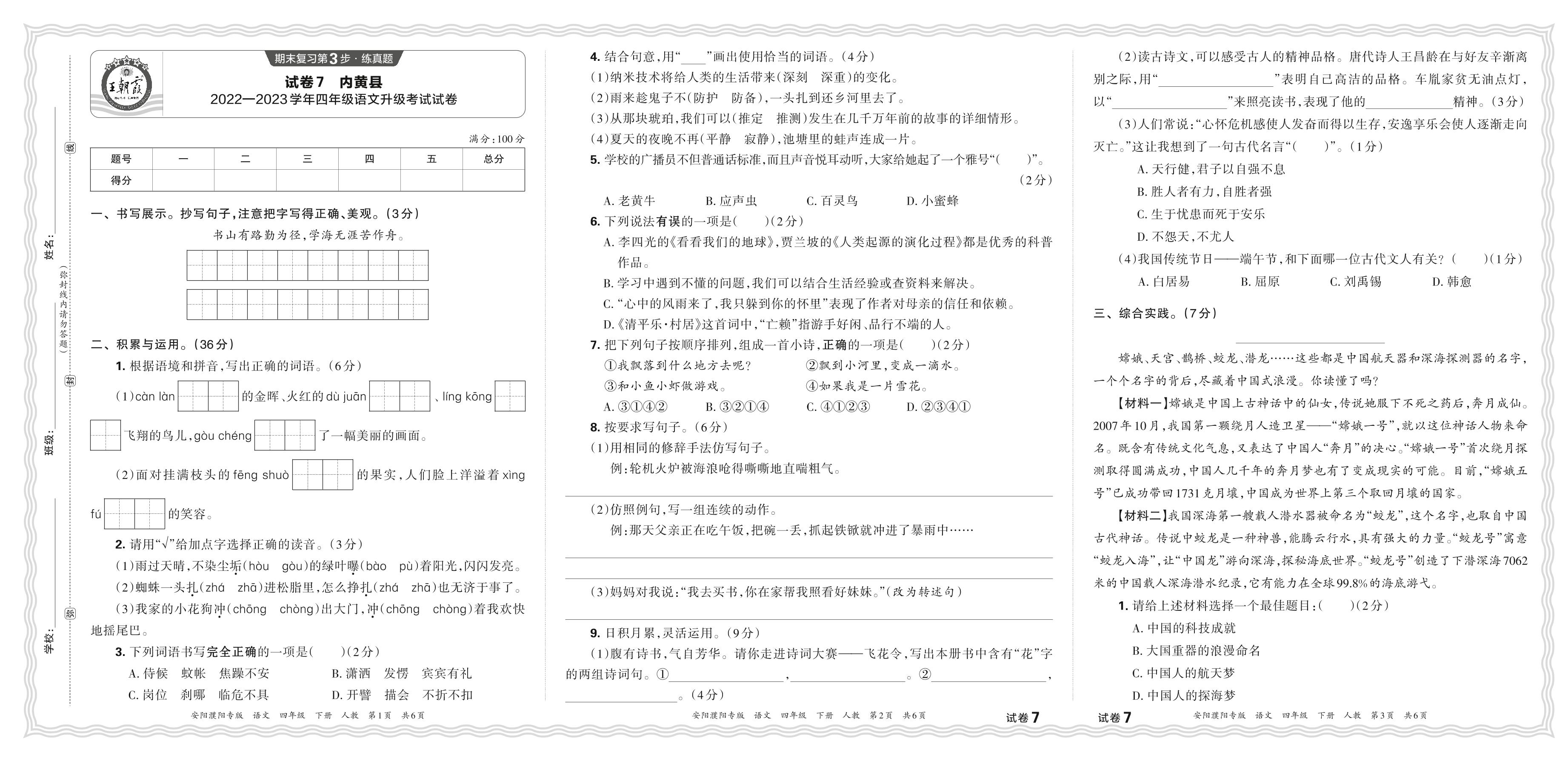 河南省安阳市内黄县2022-2023学年四年级语文升级考试试卷(人教版)【7】