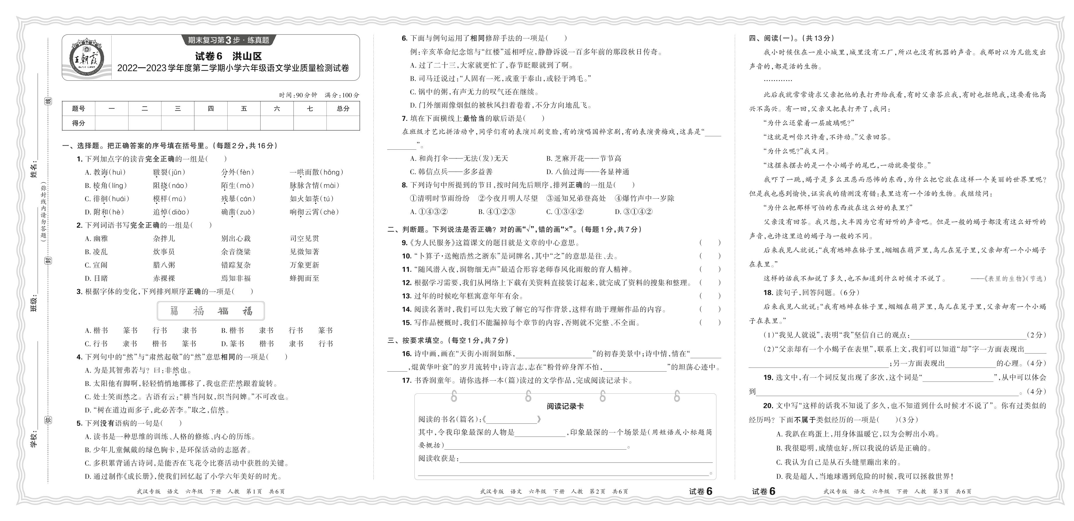 湖北省武汉市洪山区2022—2023学年度第二学期小学六年级语文学业质量检测试卷(人教版)【6】