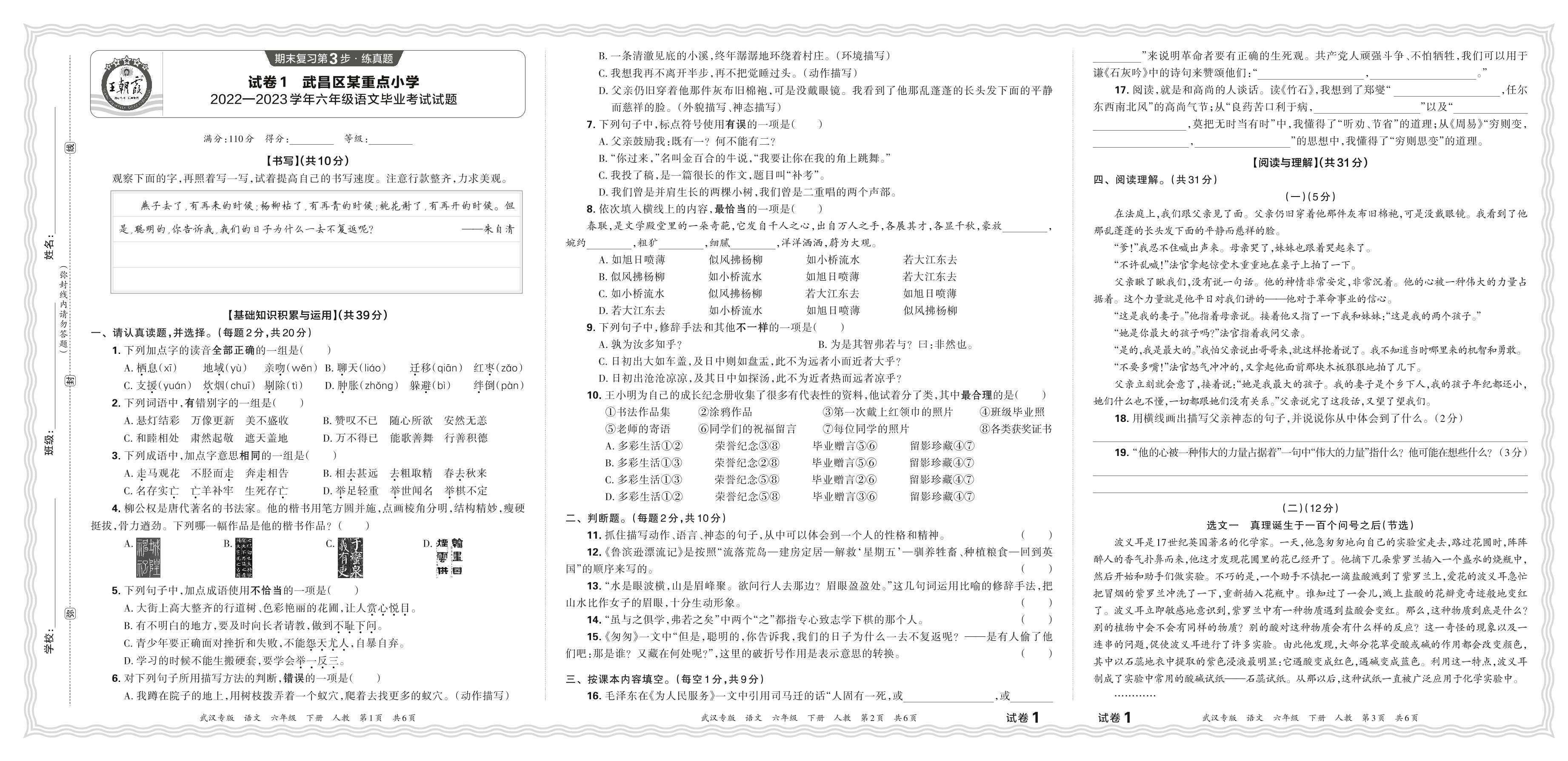 湖北省武汉市武昌区某重点小学2022—2023学年六年级语文毕业考试试题(人教版)【1】