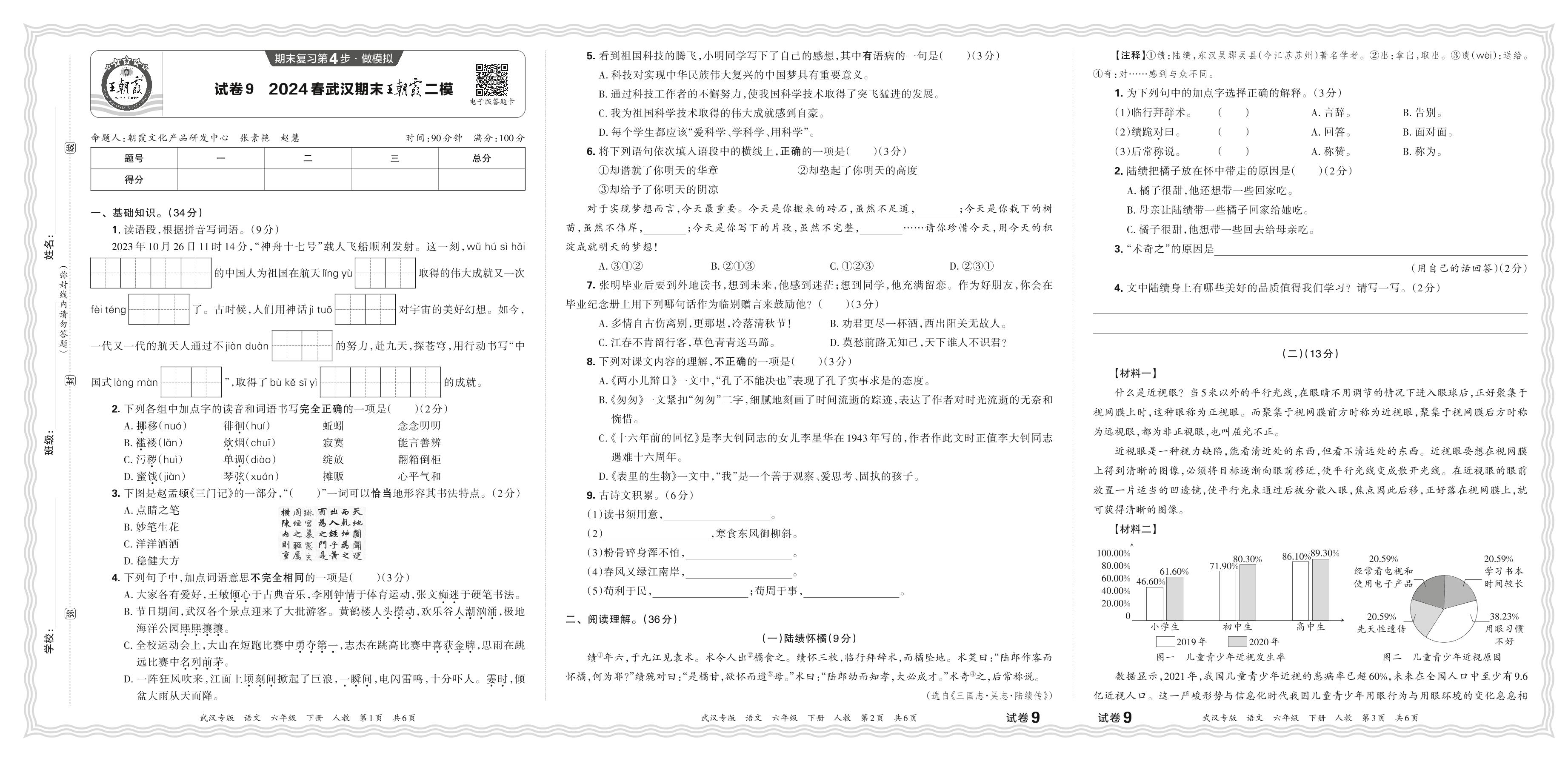 2024春下册六年级语文人教版 湖北武汉期末王朝霞二模