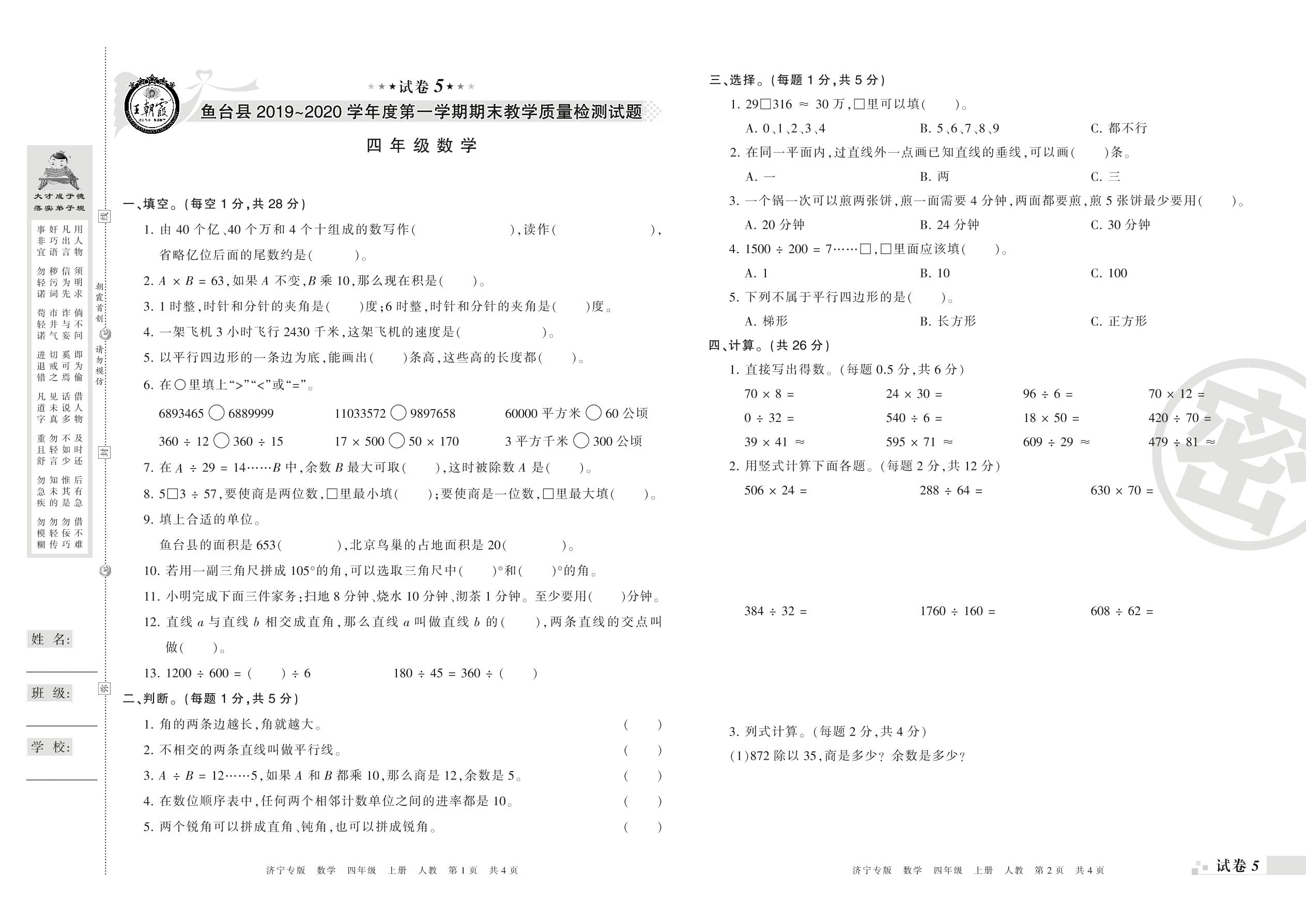 2019-2020学年第一学期济宁市鱼台县四年级数学试卷(人教版)【5】