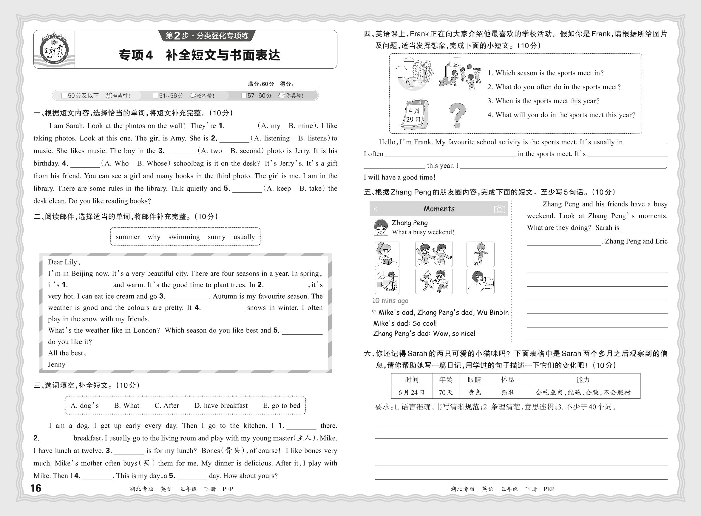 2024春下册五年级英语人教PEP版 期末专项卷湖北版·补全短文与书面表达【4】