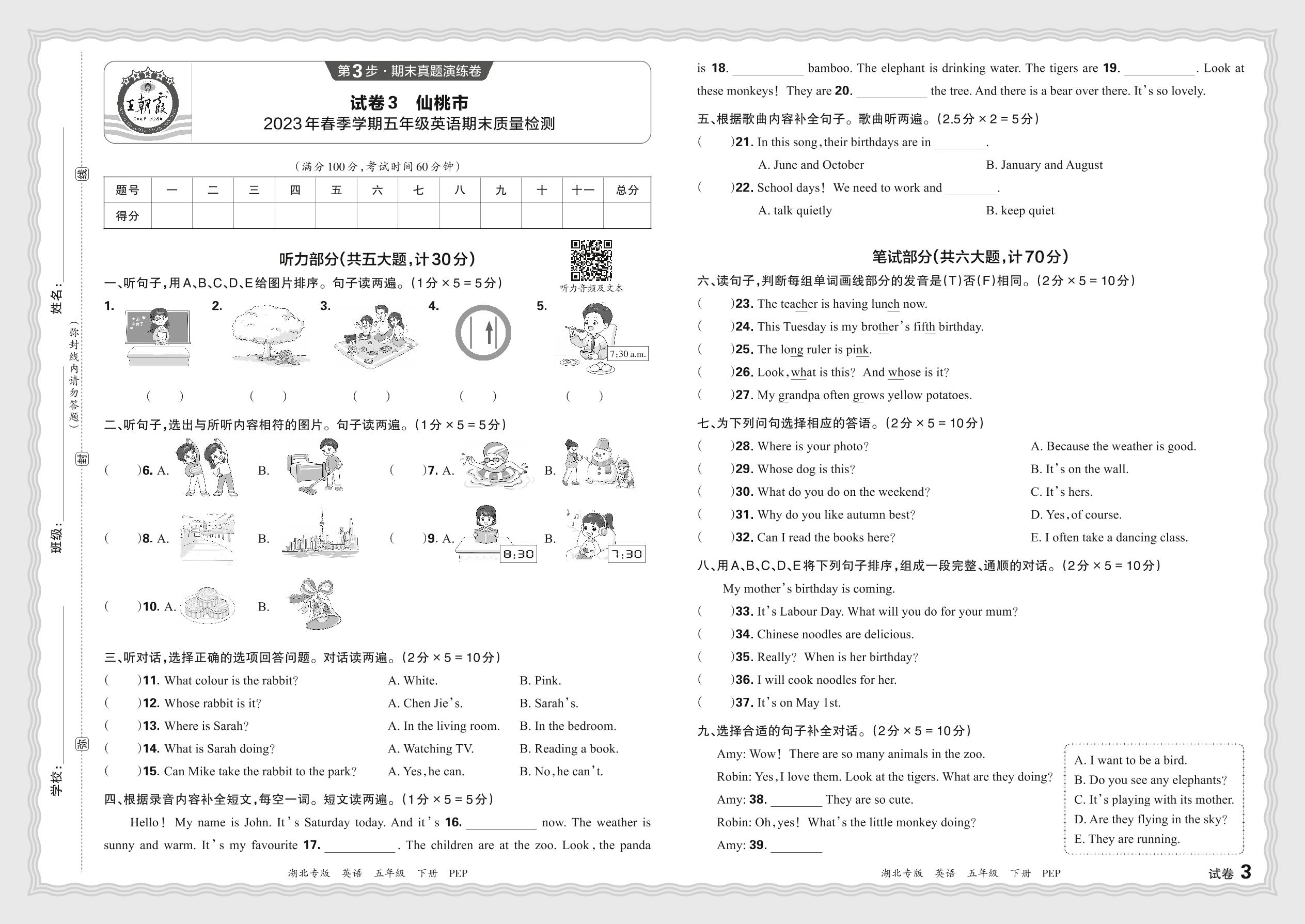 湖北省仙桃市2023年春季学期五年级英语期末质量检测(人教PEP版)【3】