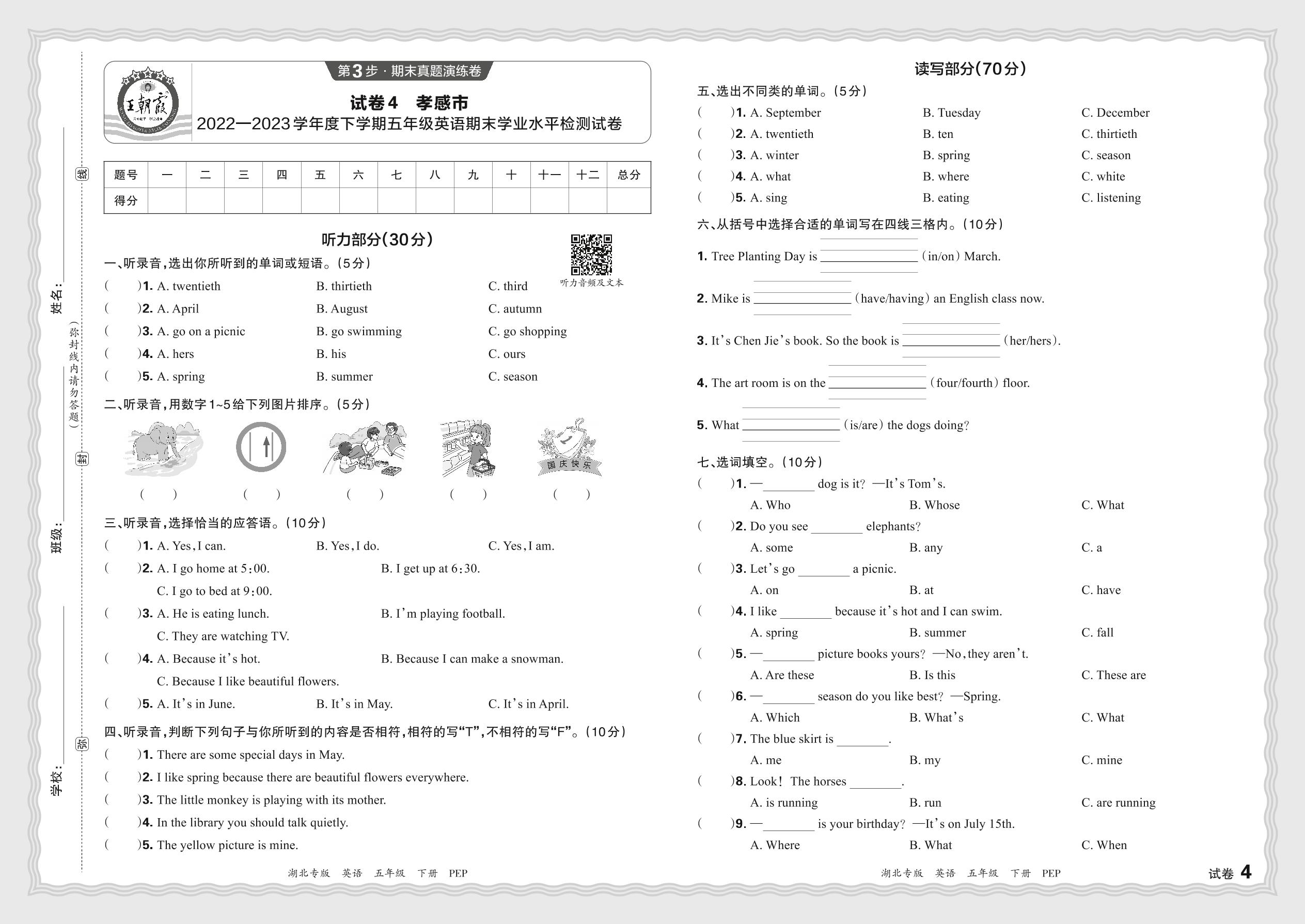 湖北省孝感市2022—2023学年度下学期五年级英语期末学业水平检测试卷(人教PEP版)【4】