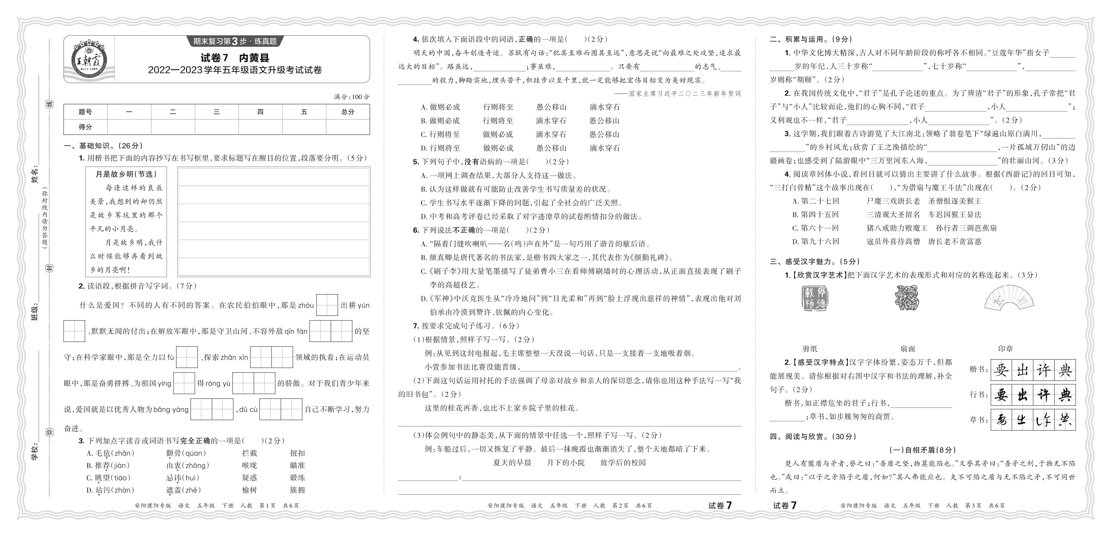 河南省安阳市内黄县2022-2023学年五年级语文升级考试试卷(人教版)【7】