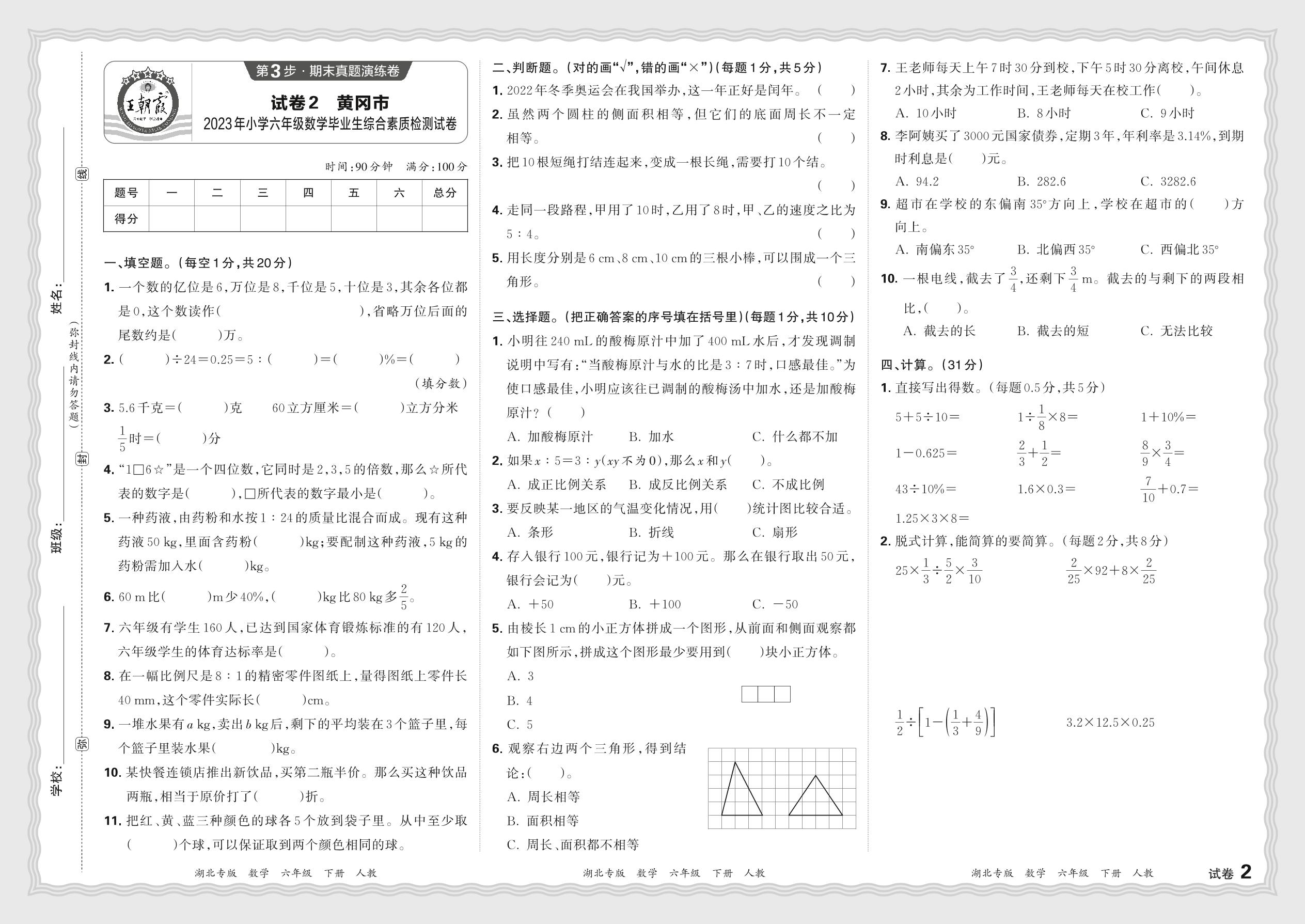 湖北省黄冈市2023年小学六年级数学毕业生综合素质检测试卷(人教版)【2】