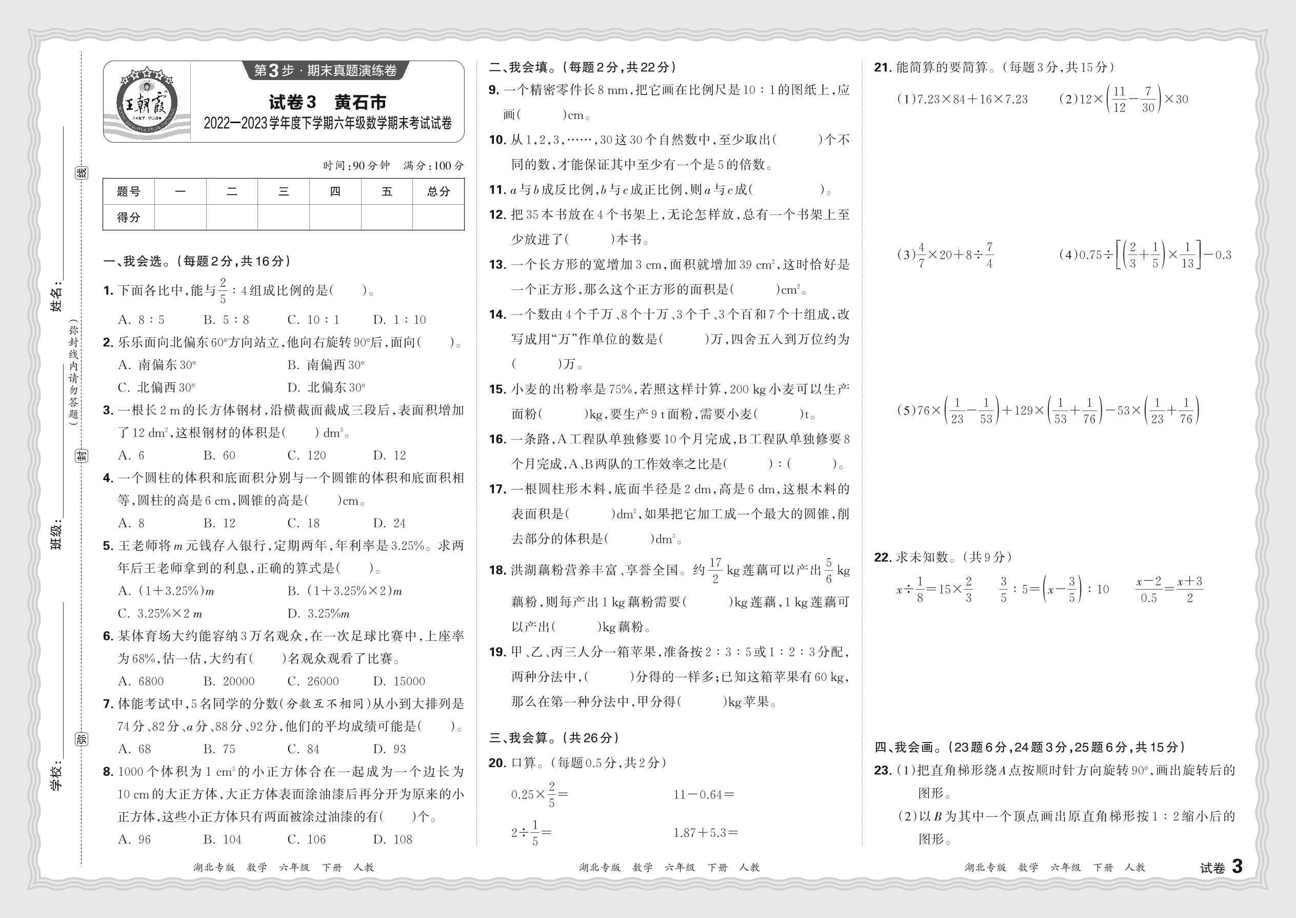 湖北省黄石市2022—2023学年度下学期六年级数学期末考试试卷(人教版)【3】