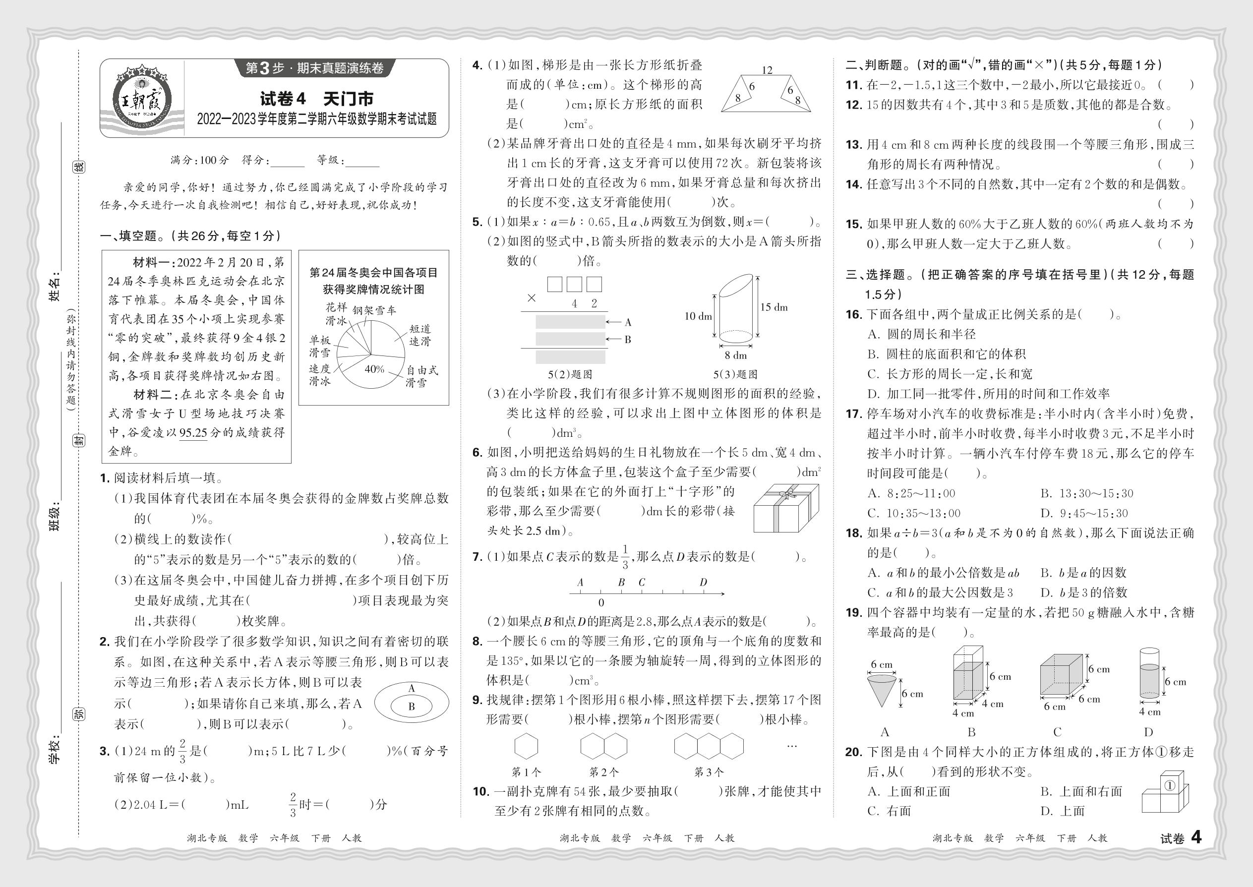 湖北省天门市2022—2023学年度第二学期六年级数学期末考试试题(人教版)【4】