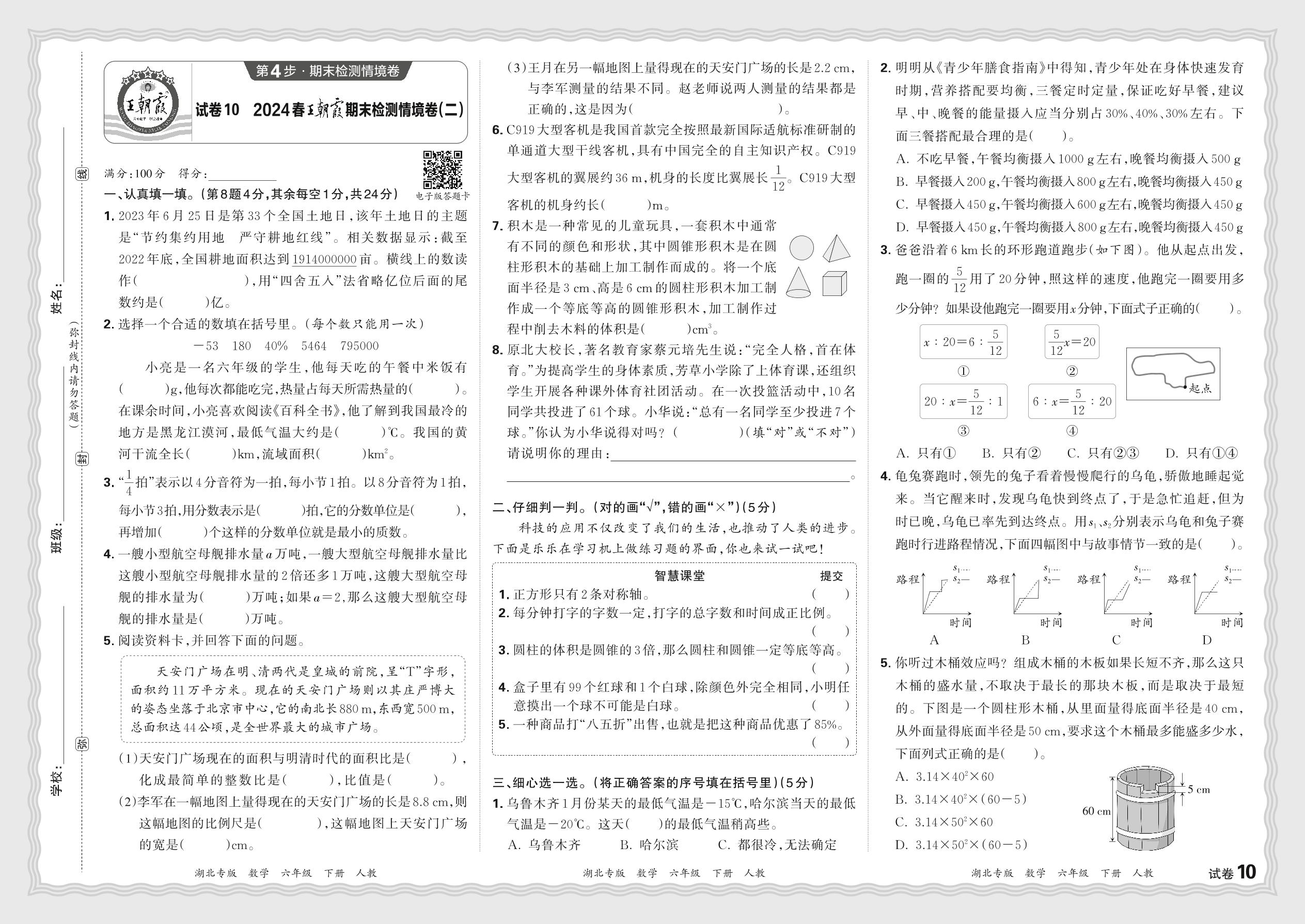 2024春下册六年级数学人教版 湖北王朝霞期末检测情境卷(二)