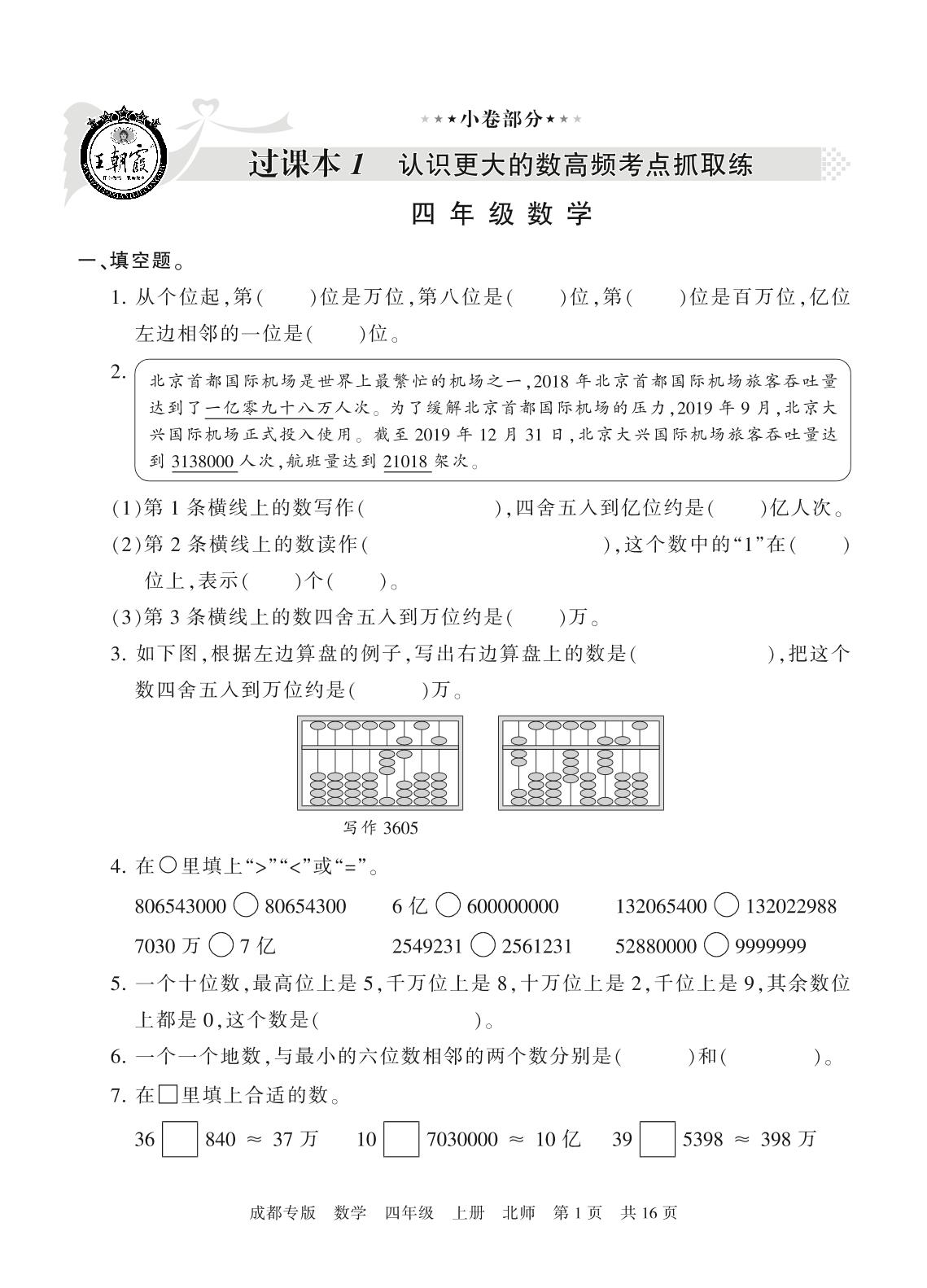 四年级数学北师版上册过课本