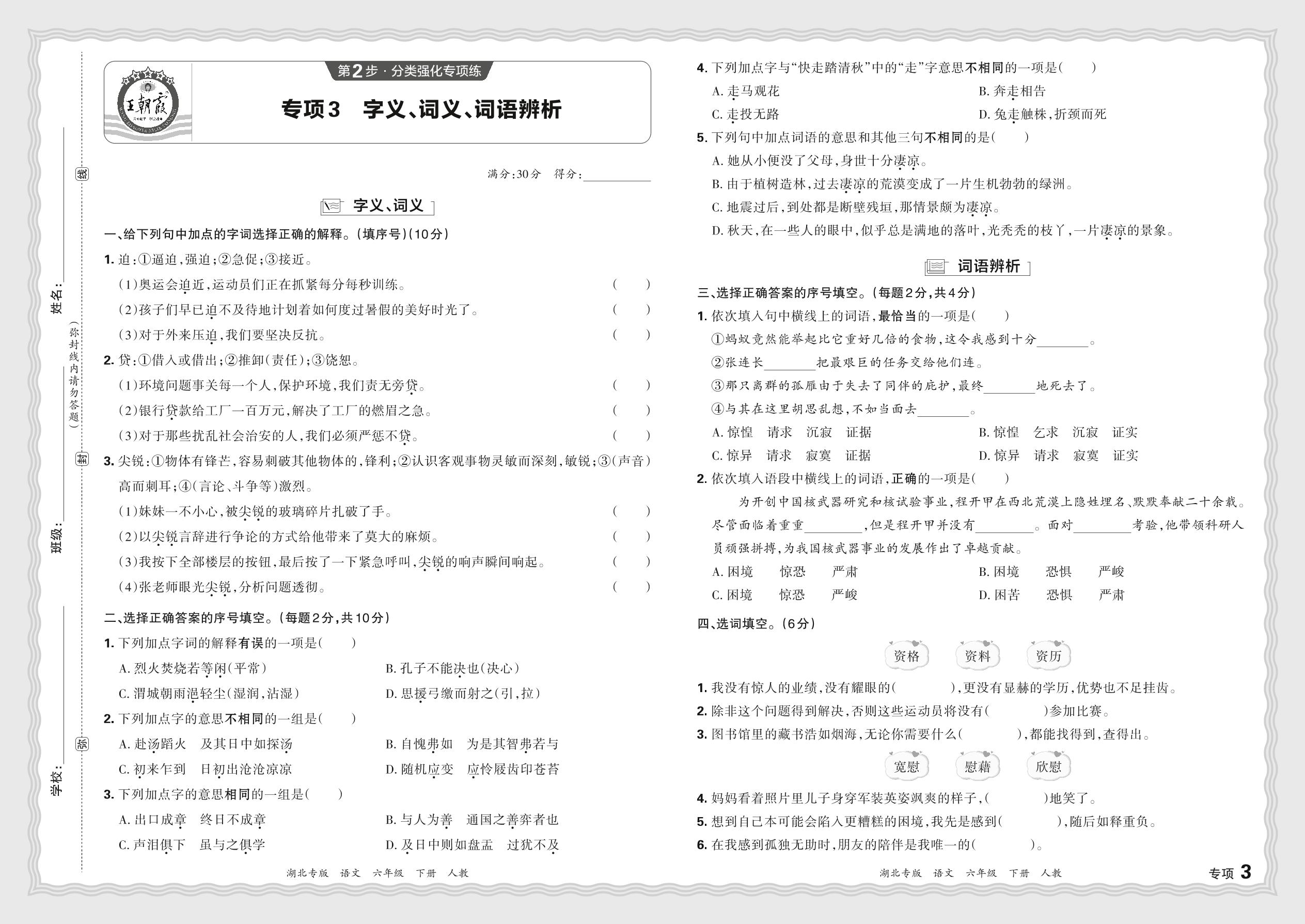 2024春下册六年级语文人教版 期末专项卷湖北版·字义、词义、词语辨析【3】