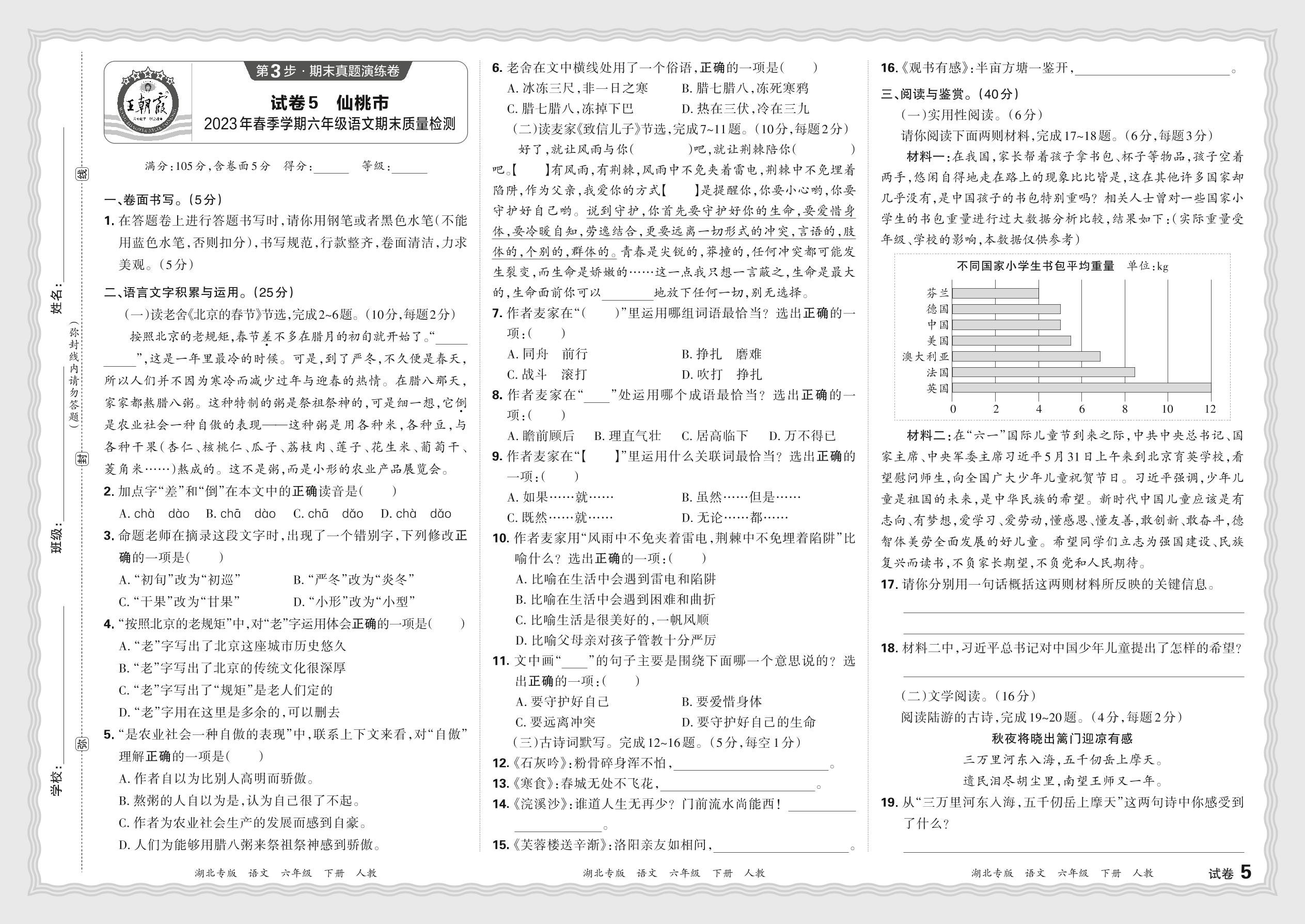 湖北省仙桃市2023年春季学期六年级语文期末质量检测(人教版)【5】