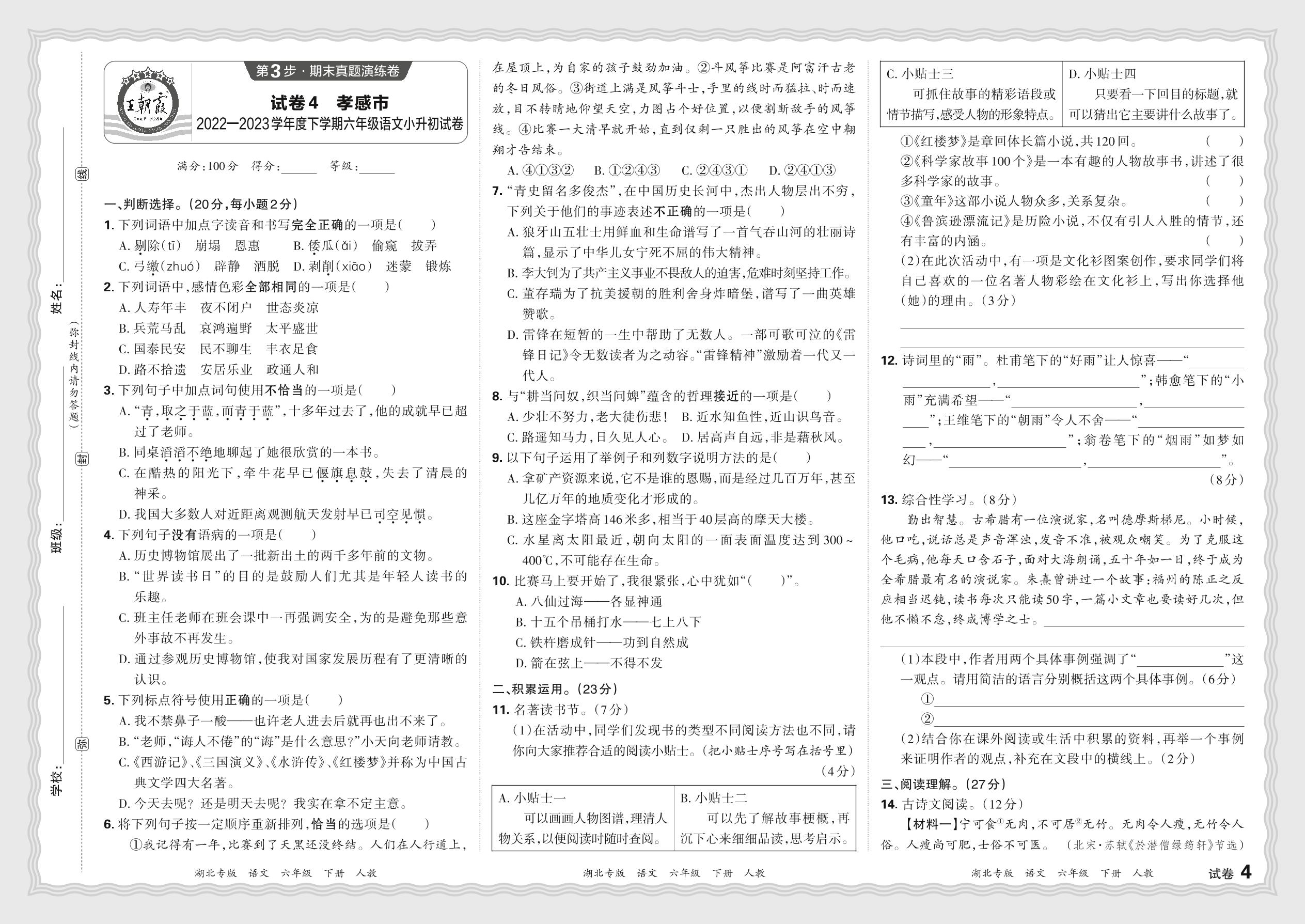 湖北省孝感市2022—2023学年度下学期六年级语文小升初试卷(人教版)【4】