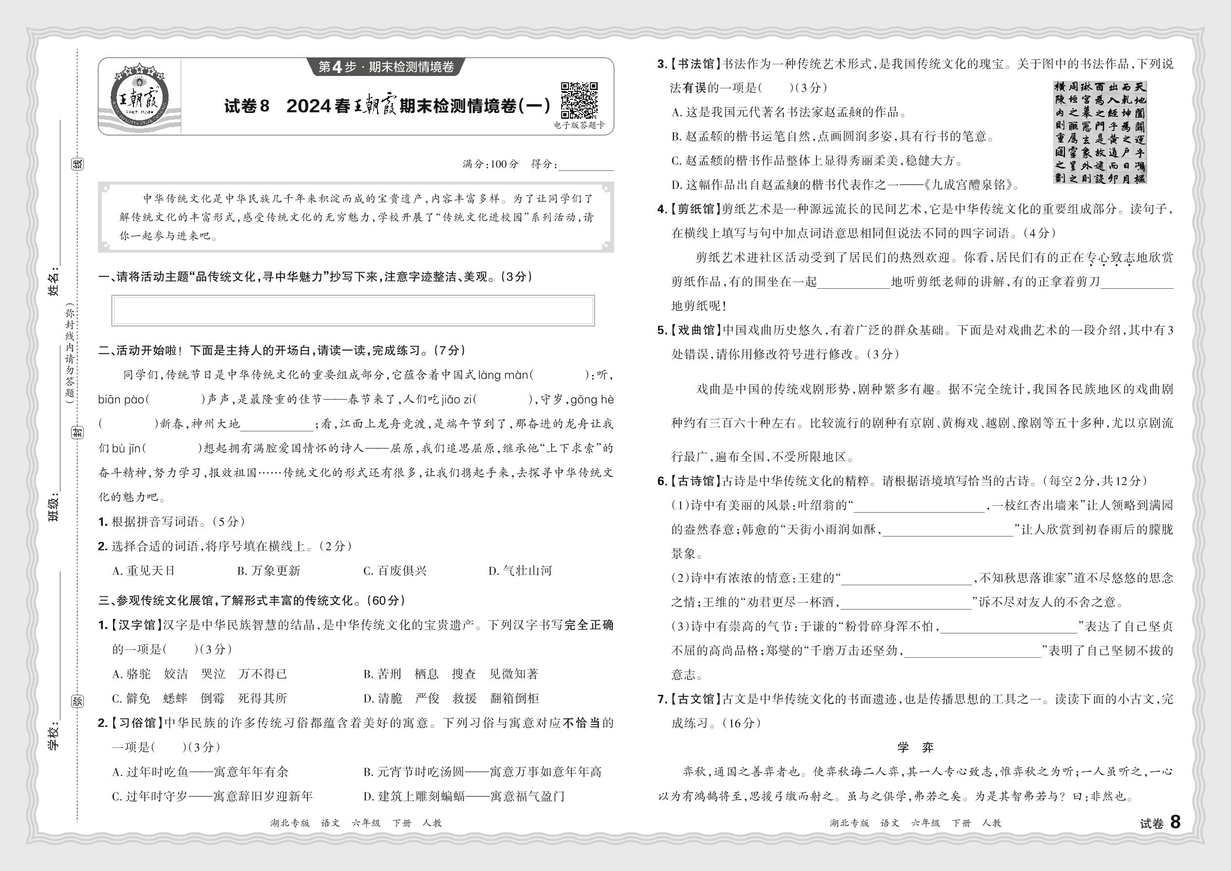 2024春下册六年级语文人教版 湖北王朝霞期末检测情境卷(一)